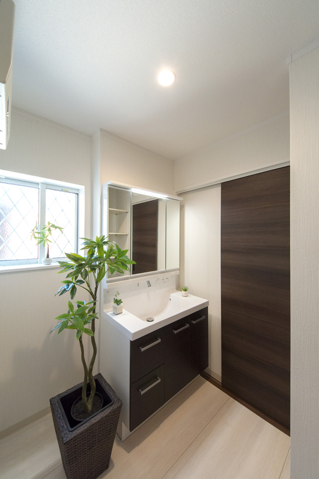 清潔感のあるサニタリールーム。洗面化粧台扉を、ダークブラウン系の色でアクセントにしました。