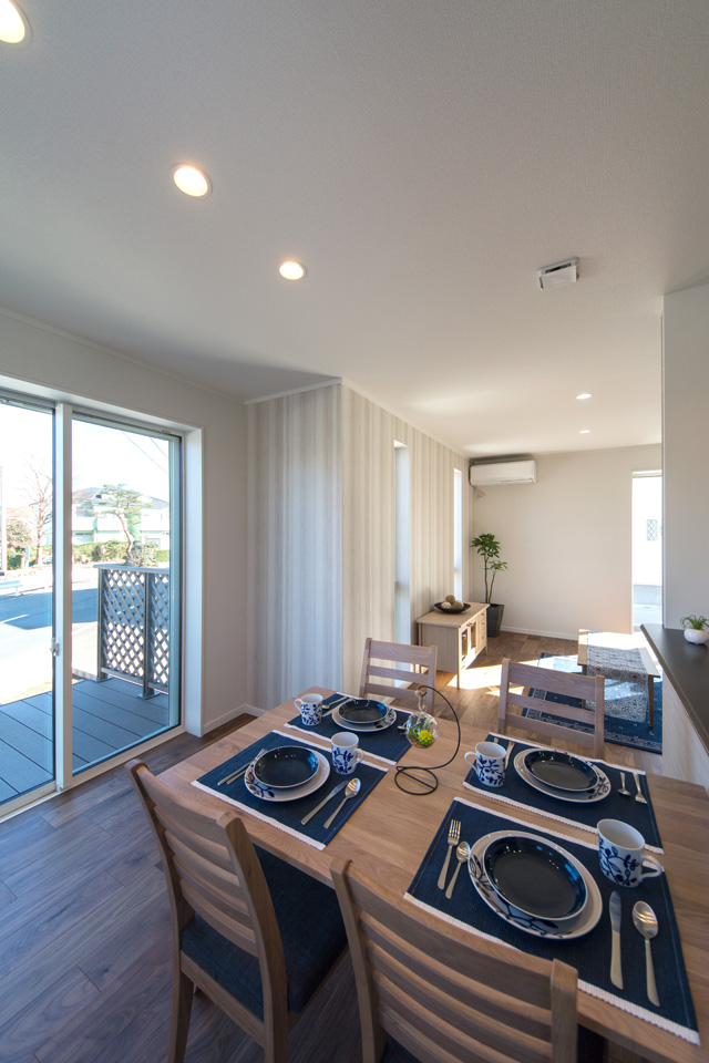 ダイニングからウッドデッキが視界に入り、ちょっとしたカフェテラスの様な空間です。