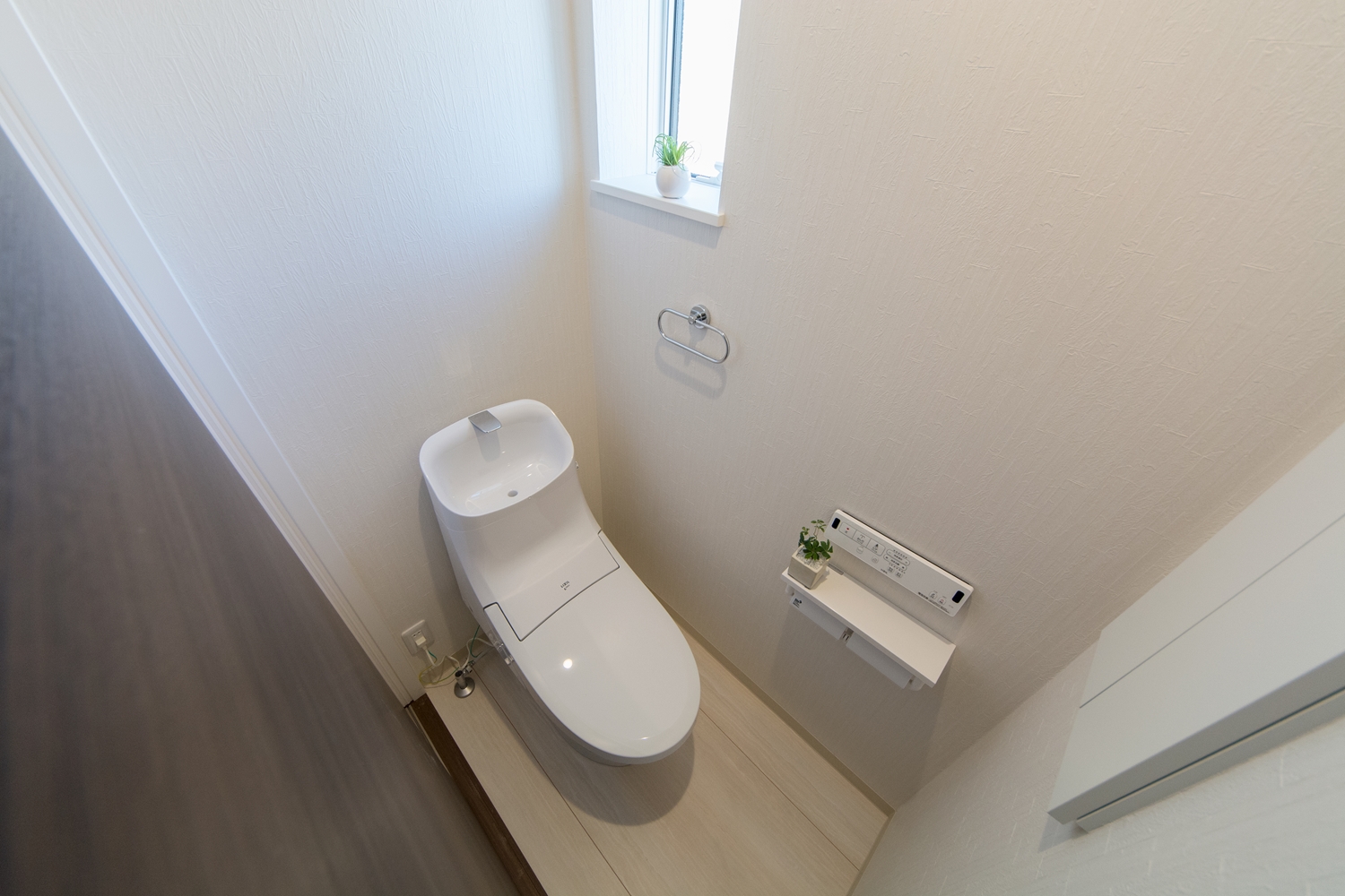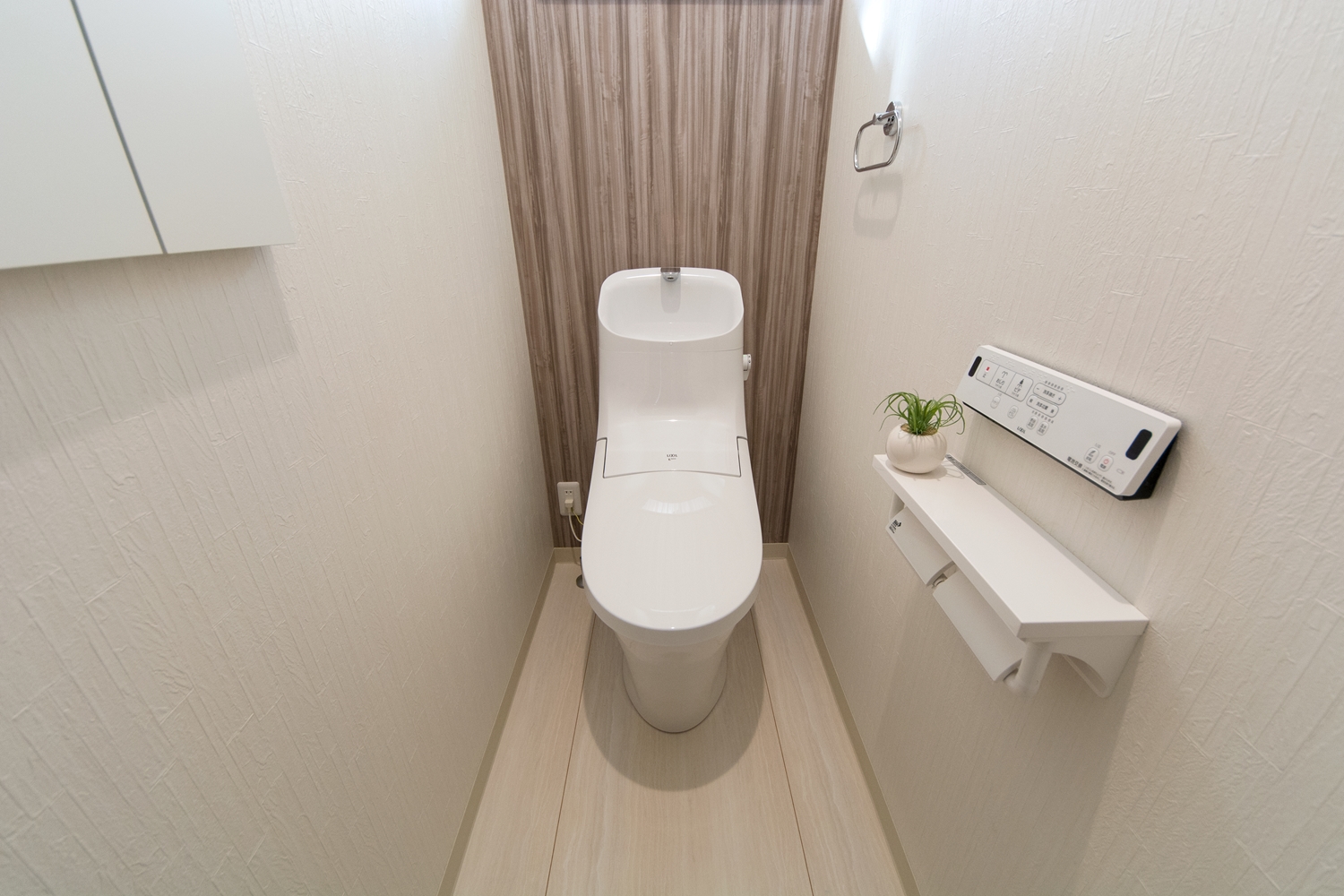 白を基調とした清潔感のある2階トイレ。木目調のアクセントクロスがワンポイントでオシャレです。