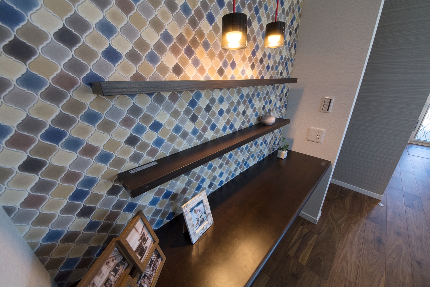 カラフルなアクセントクロスをあしらったカウンタースペース。書斎やPCペースなど使い方様々な自由空間です。