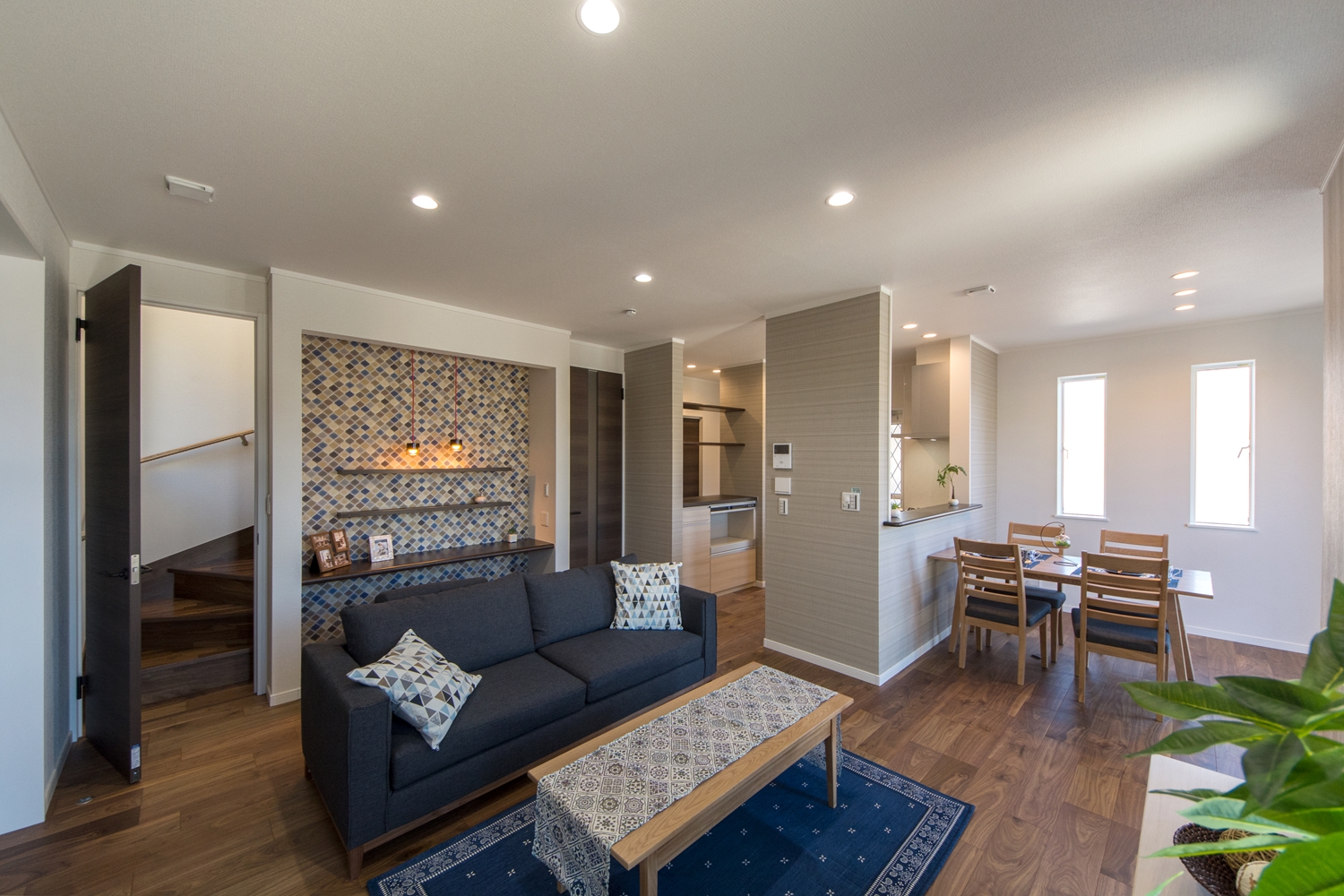 深い色合いの木目が風格ある表情を生む、ブラックウォルナットのフローリングにリゾートチックな配色の室内空間。