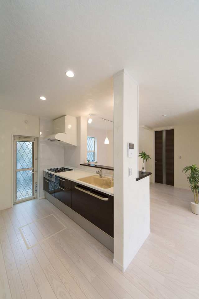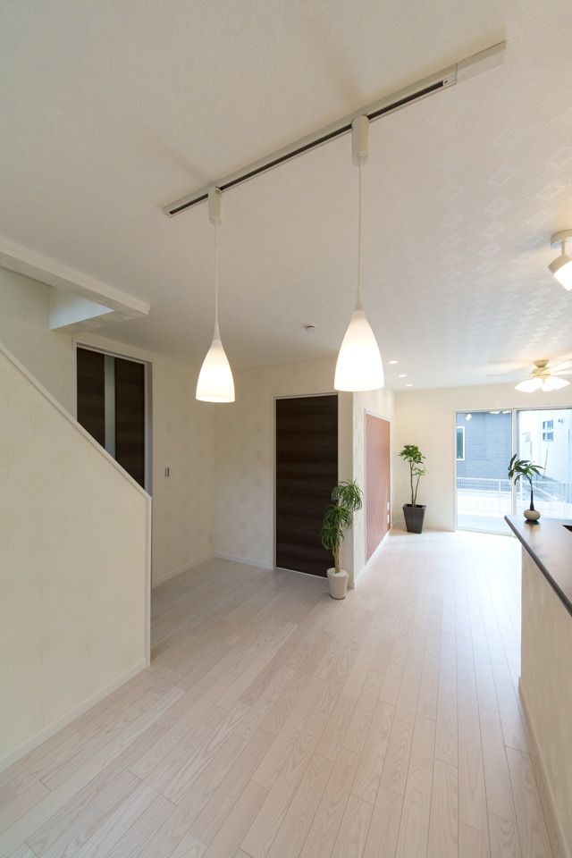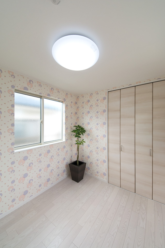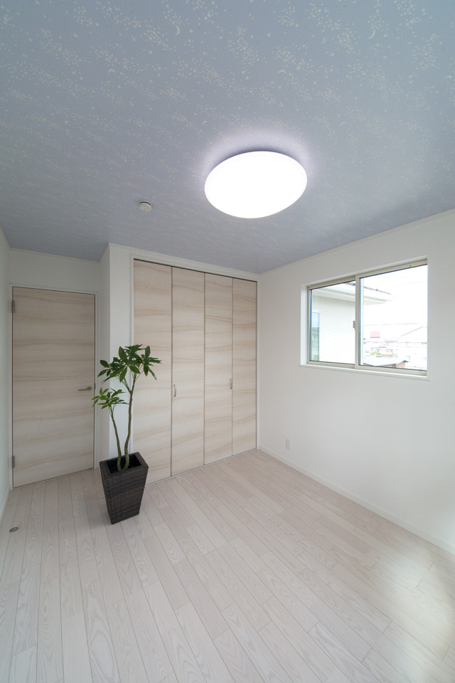 ホワイトの石目柄をベースに木目調ブラウンをアクセントとしたナチュラルテイストな外観。内装は、キラリと光る壁や、大好きなキャラクターの壁、エレンガントな天井にプラネタリウムの様に光る天井、お部屋ごとにお客様好みにカスタマイズしました。