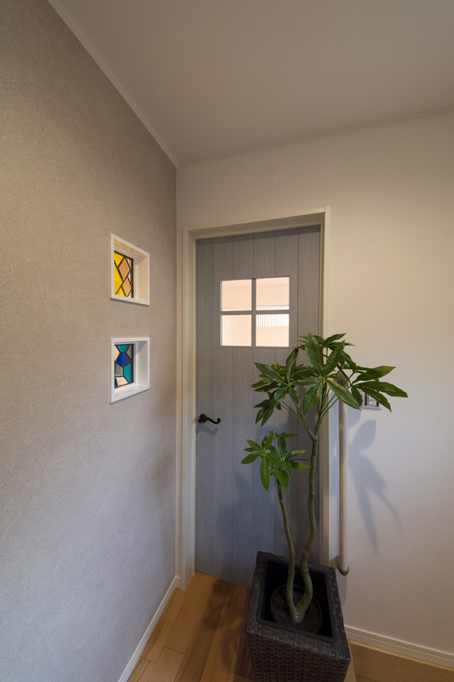 小窓のついたリビングドアとステンドグラス前は、いつも必ず通る場所。癒しの空間となりました。