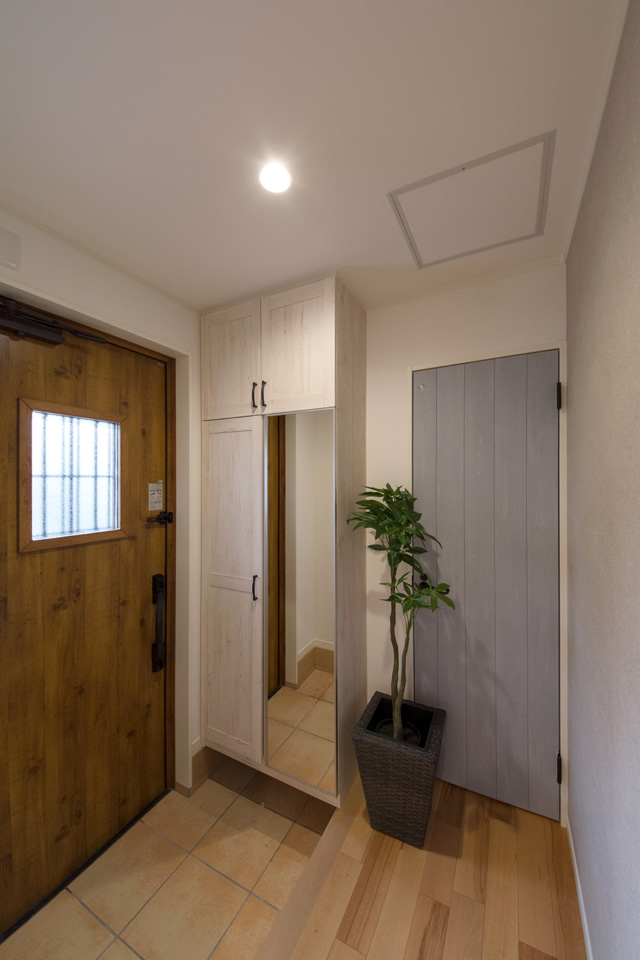シャビーシックなテイストのドアや収納BOXに囲まれ、自然を感じる玄関ホール。