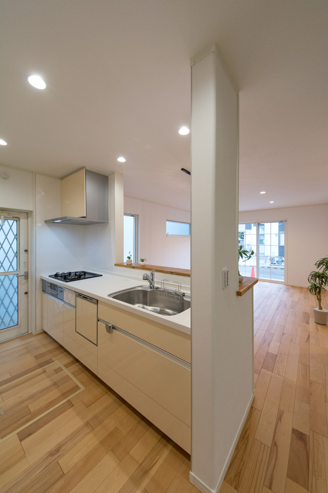 キッチンから、リビング、ダイニングが見渡せ、明るく開放的で一体感があります。