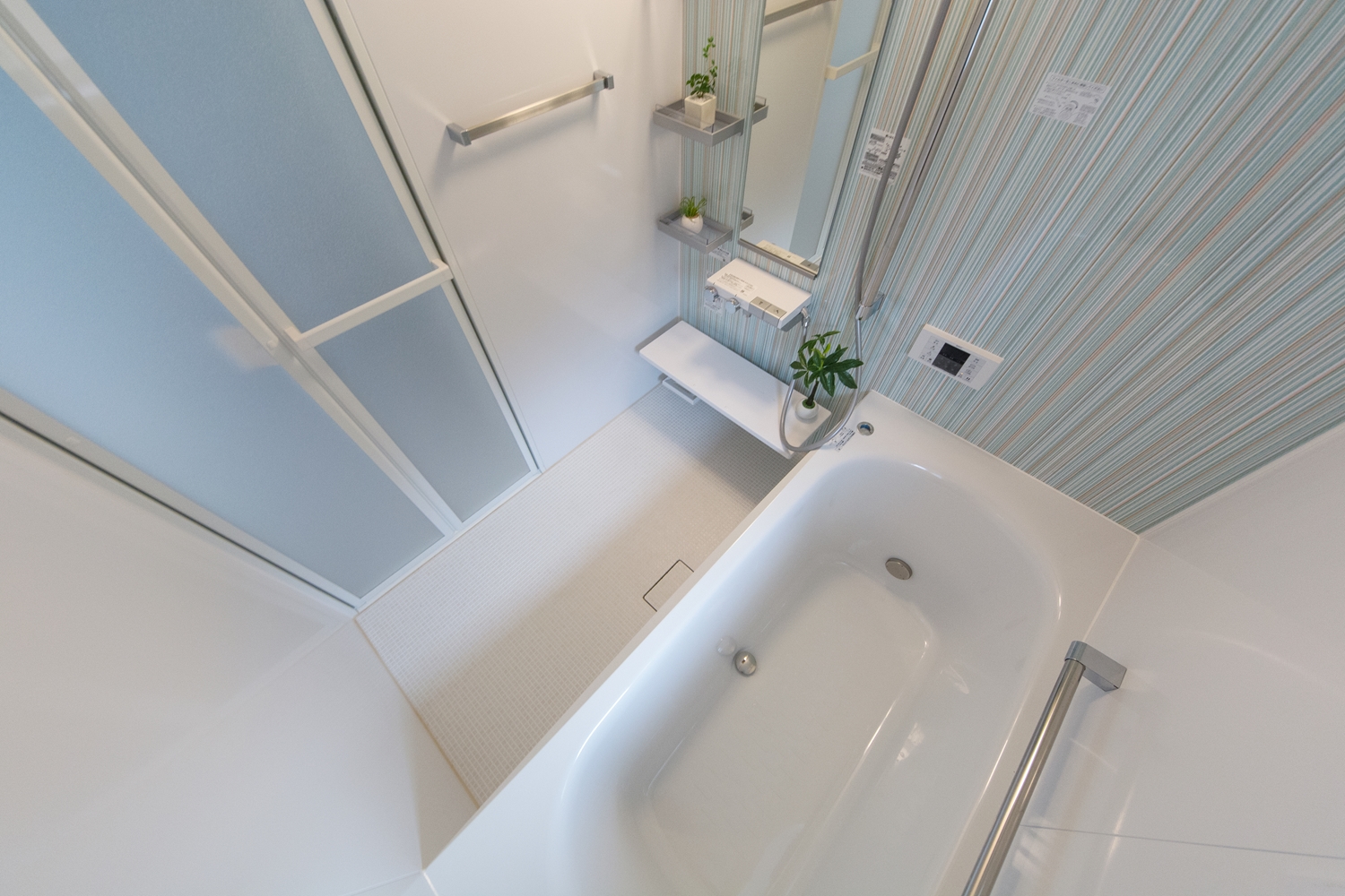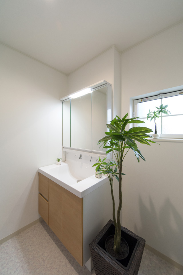 白を基調とした清潔感のあるサニタリールーム。ライトブラウンの洗面化粧台扉がナチュラルな雰囲気を演出します。