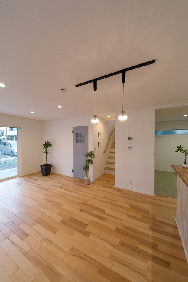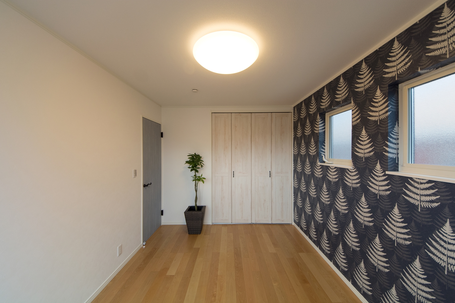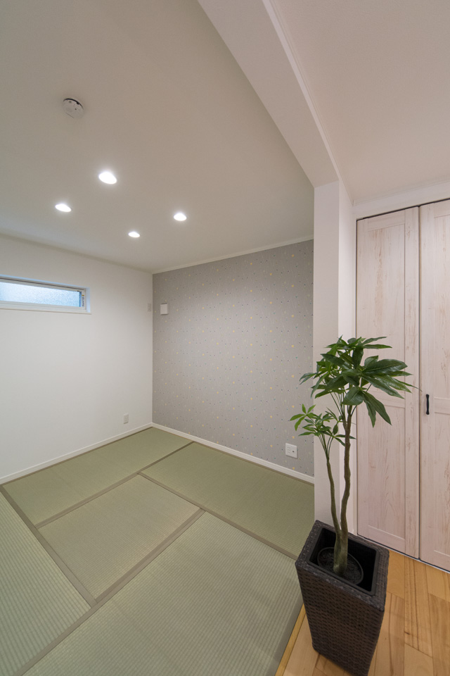 扉を無くして開放感をプラスした1階畳敷き洋室。花柄の和風クロスはオシャレで落ち着いた空間を演出します。