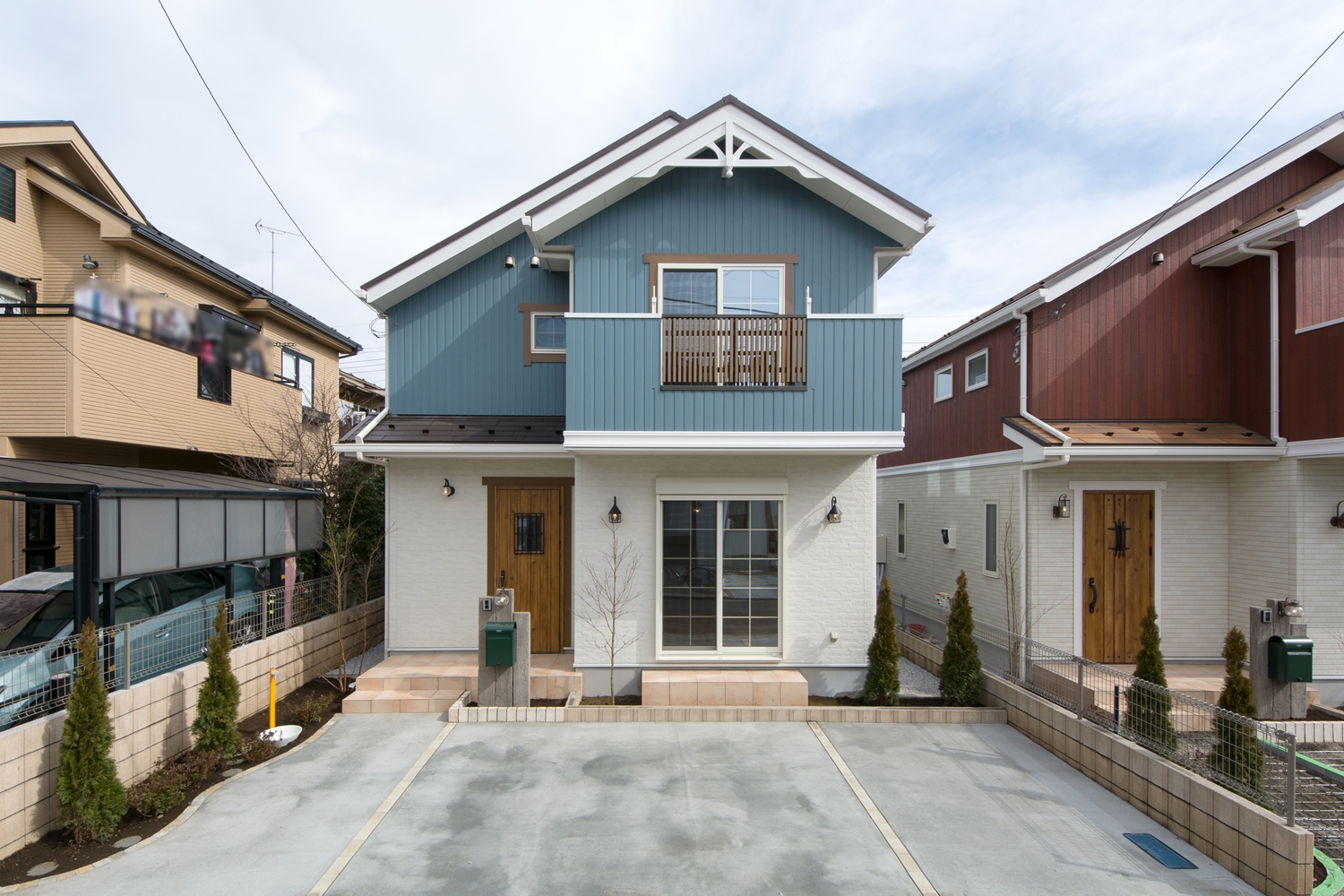 爽やかなペールブルーとホワイトを張り分けた北欧デザイン。妻飾りや窓モールなどディテールにもこだわったノルディックシリーズです。