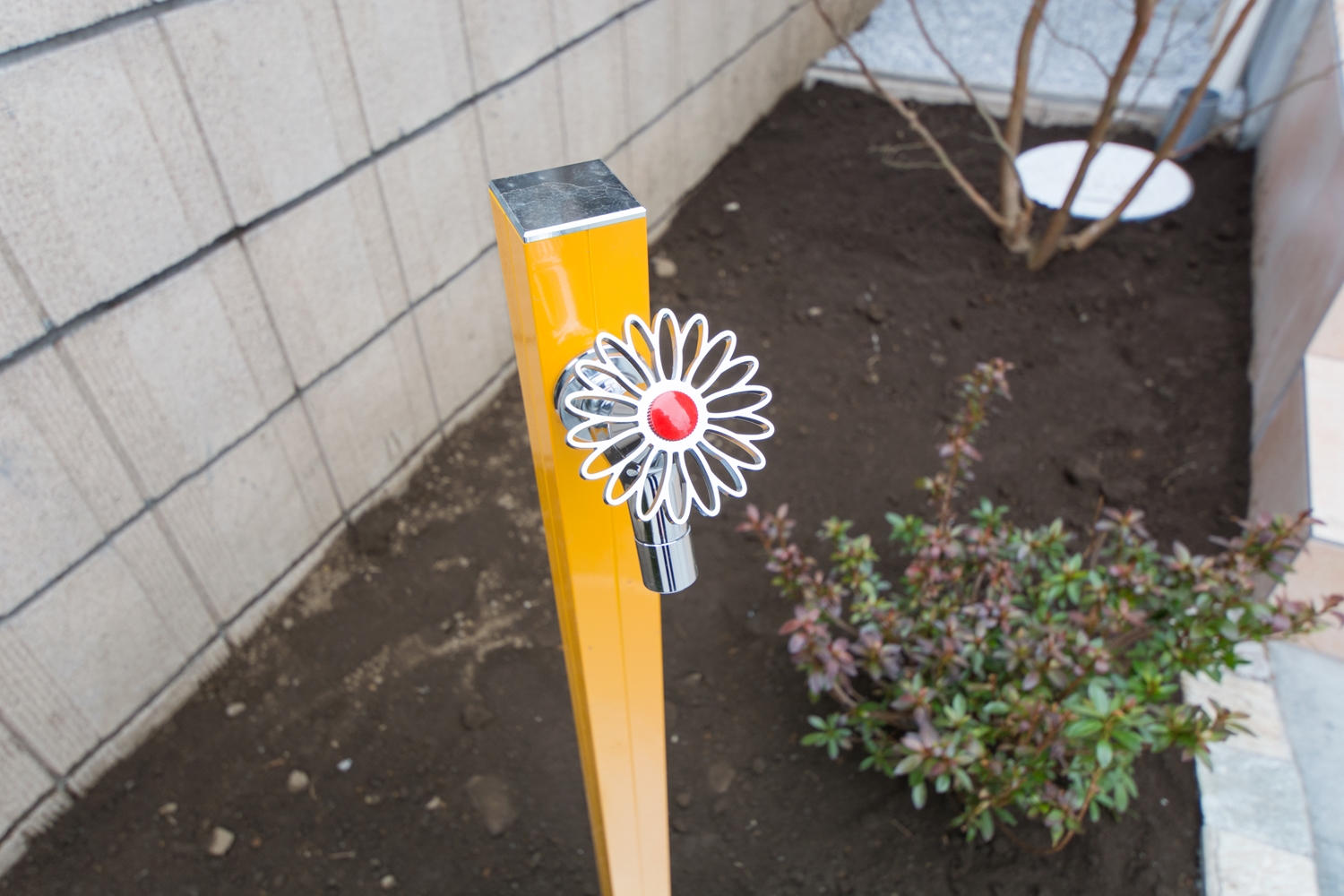 お庭の立水栓は、フラワー形のハンドルでとてもキュートです。