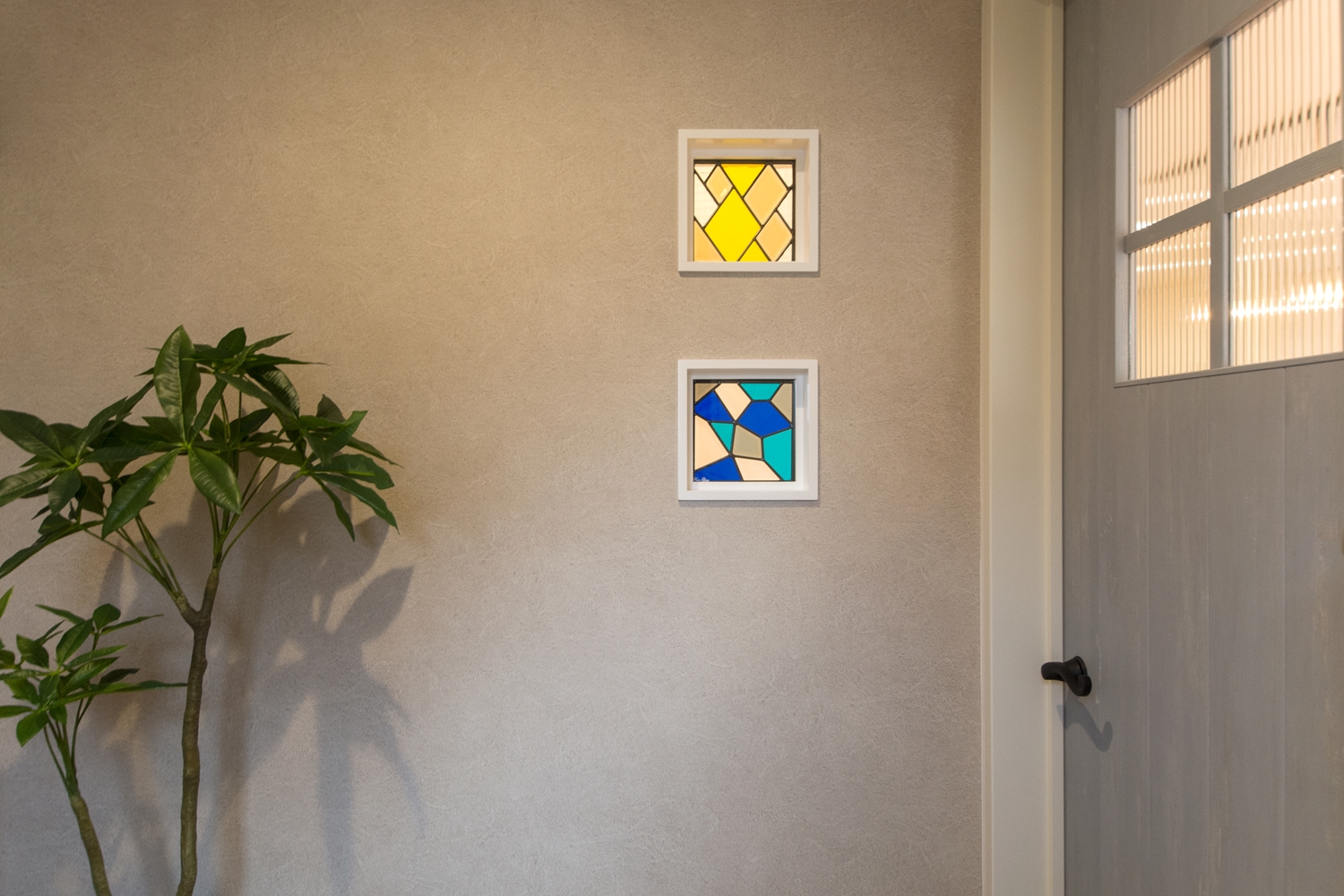 1F玄関ホールと階段前の間の壁に、ハンドメイドのステンドグラスを取り入れました。