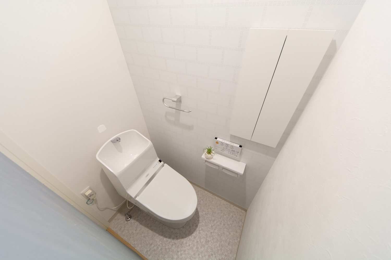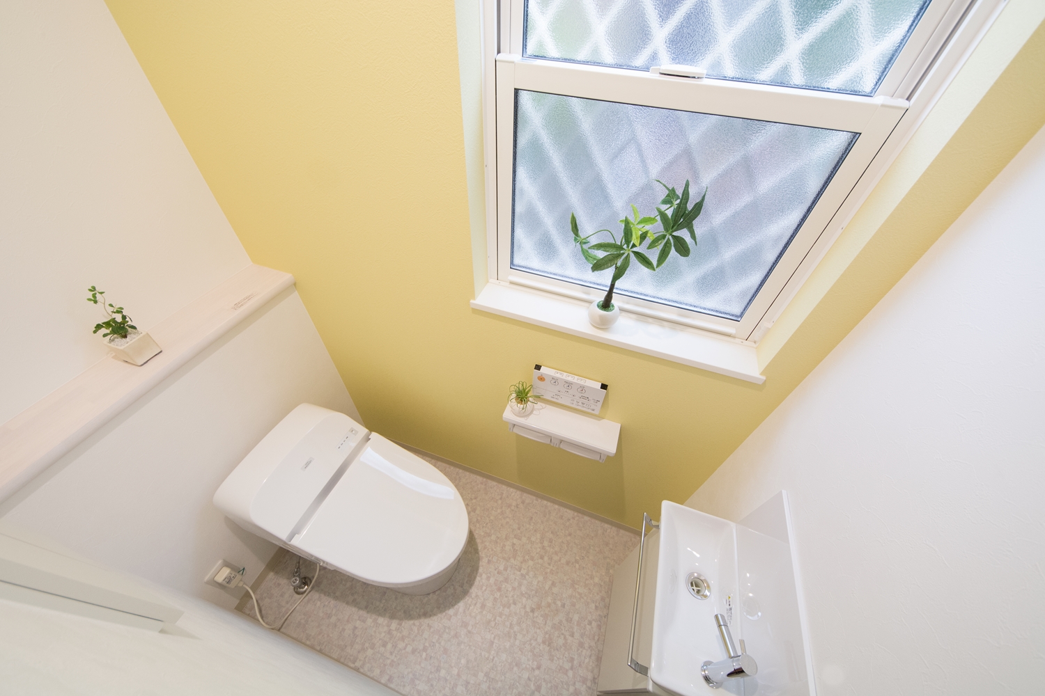 ライトイエローのアクセントクロスが印象的な1階トイレ。