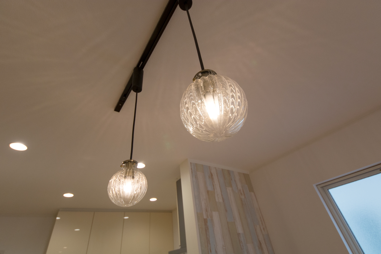 ダイニングテーブルを暖かい光で包むお洒落なガラス製ペンダントライト。