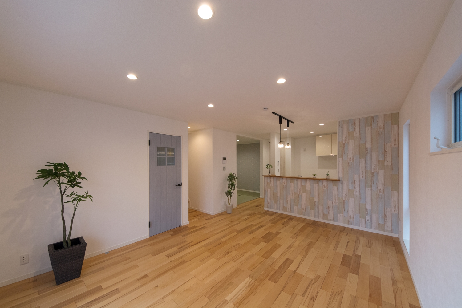 シャビー感のある木目調クロスやリビングドアがアクセントになってオシャレな空間を演出します。