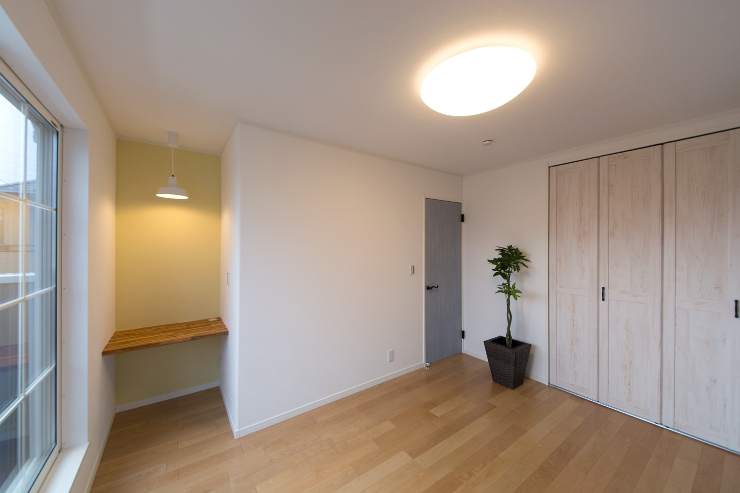 お部屋の一角にカウンタースペースを設置しました。専用のペンダントライトとイエローのアクセントクロスがオシャレな空間を演出。