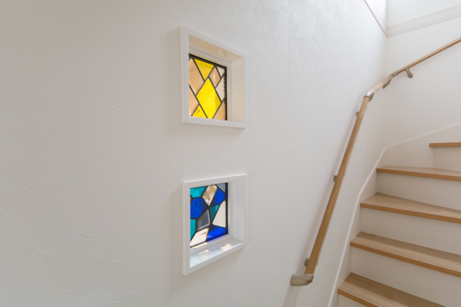 1F階段前と玄関ホールの間の壁に、ハンドメイドのステンドグラスを取り入れました。