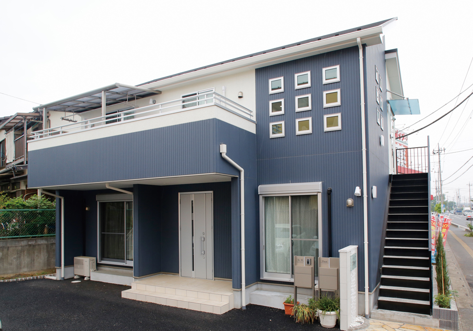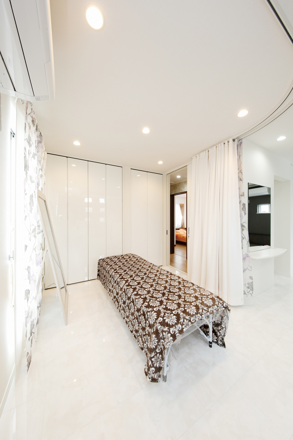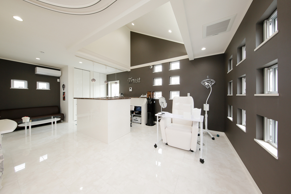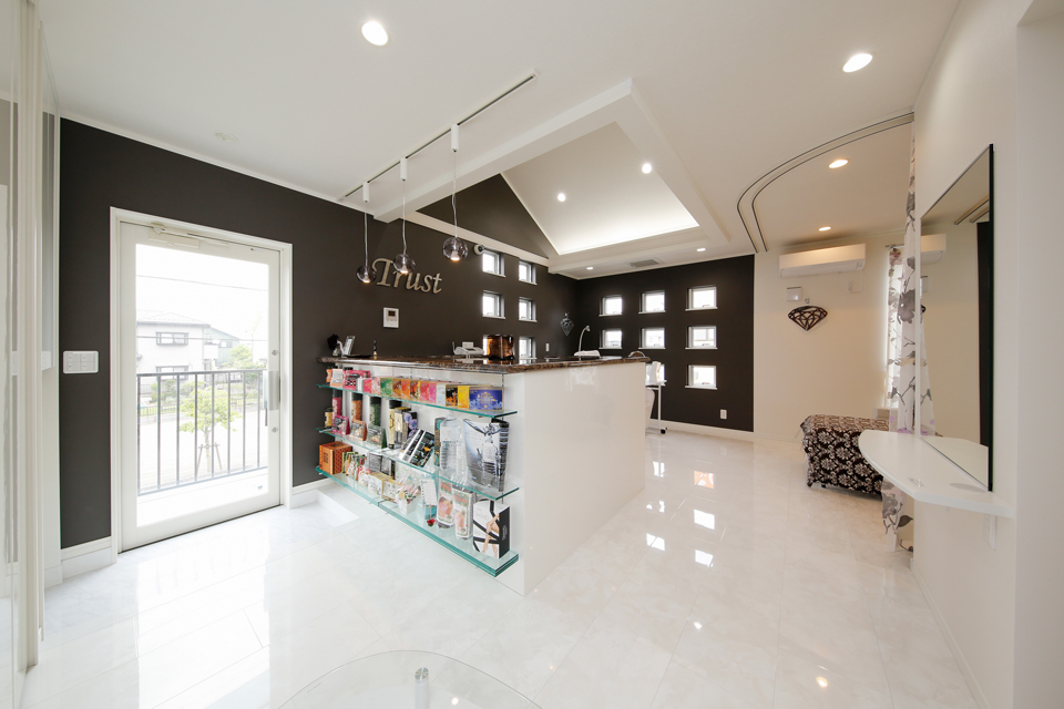 ゆとりある居住スペースに加え、エステサロンを設けた店舗併用住宅。 居住スペースにはバリアフリー設計を取り入れ、店舗部分はお客様からの期待が高まる高級感のあるデザイン。 解放感のあるリビングやゆったりとしたバスルームにもこだわりが感じられます。 また、主要道路に面しているため、人の目を意識したアプローチや動線の外階段を設けるなど、店舗に必要なポイントも押さえています。