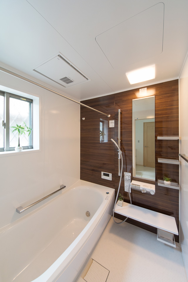 木目調ブラウンのアクセントパネルがナチュラルで落ち着いた空間を演出します。