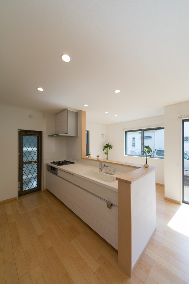 木目調アイボリーのキッチン扉と木目調ライトブラウンのカウンターがナチュラルな印象です。