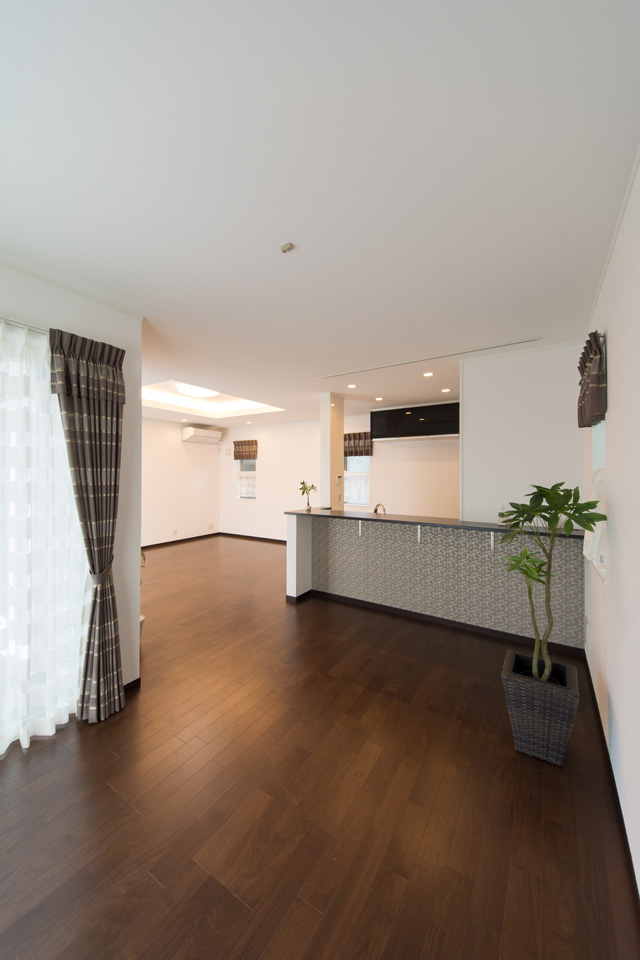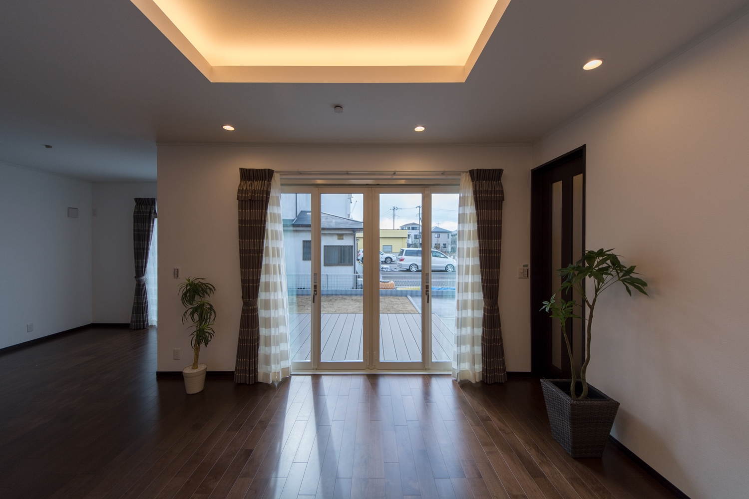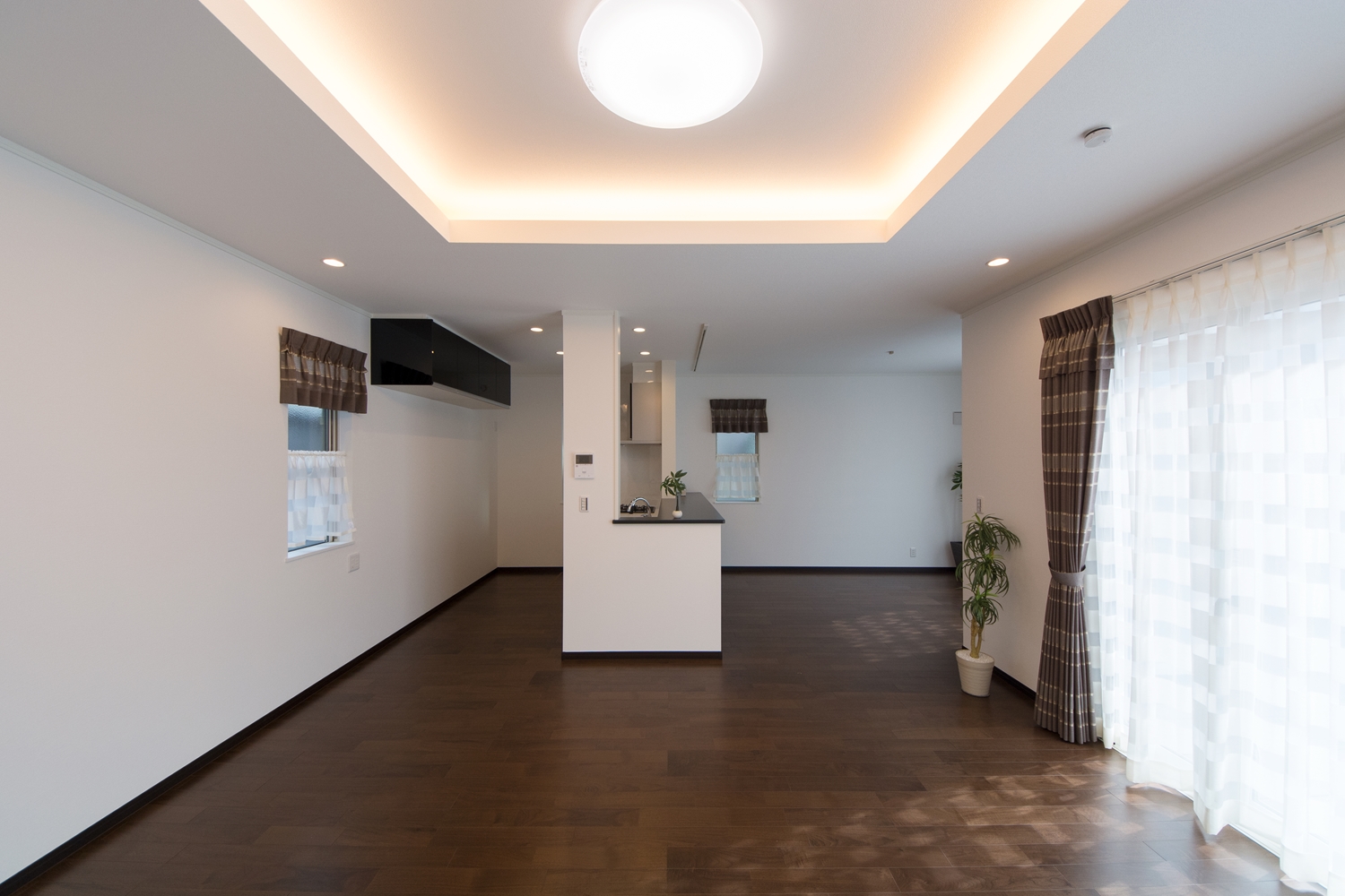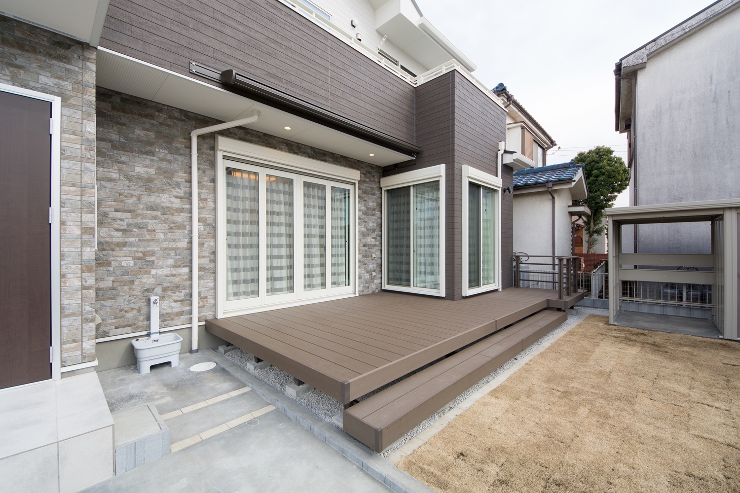 ウッドデッキが目を惹く、ホワイトとブラウン系色柄を組み合わせたナチュラル&モダンな外観。LDKは高い天井のゆったりした空間で、お洒落なカジュアルバー風スタイル。やすらぎを演出する充実した設備と仕様、ワンランク上のラグジュアリーな住まい。