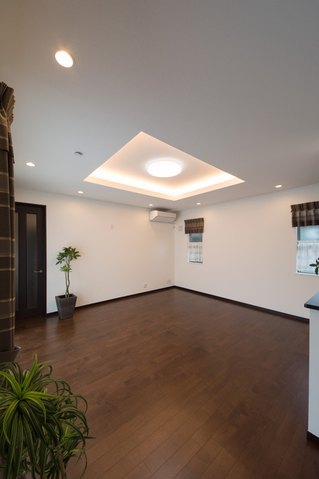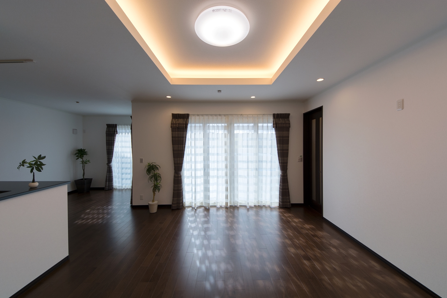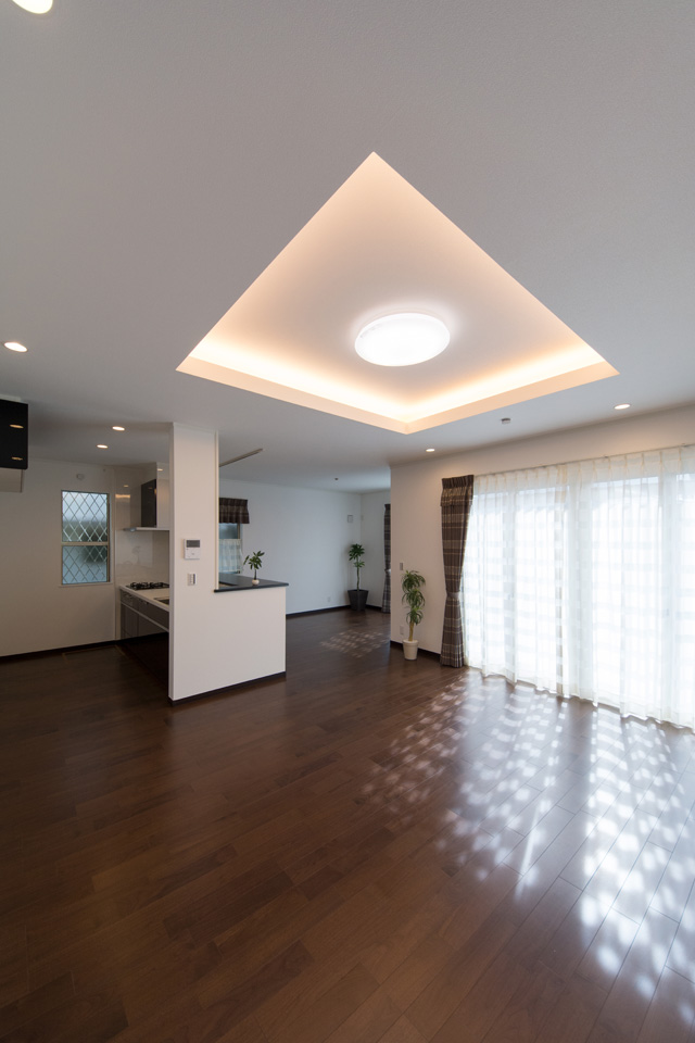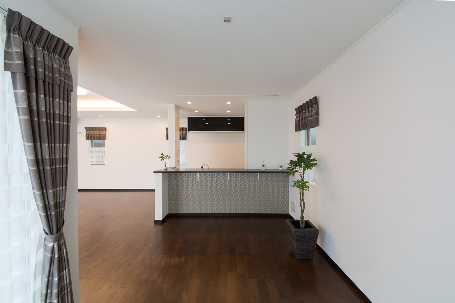 ウッドデッキが目を惹く、ホワイトとブラウン系色柄を組み合わせたナチュラル&モダンな外観。LDKは高い天井のゆったりした空間で、お洒落なカジュアルバー風スタイル。やすらぎを演出する充実した設備と仕様、ワンランク上のラグジュアリーな住まい。