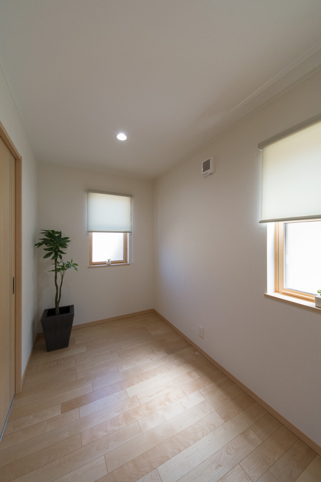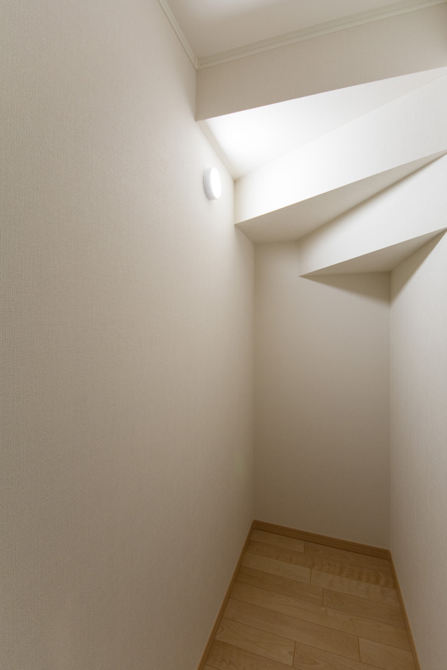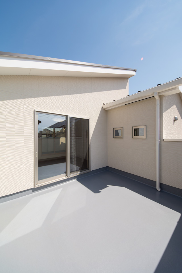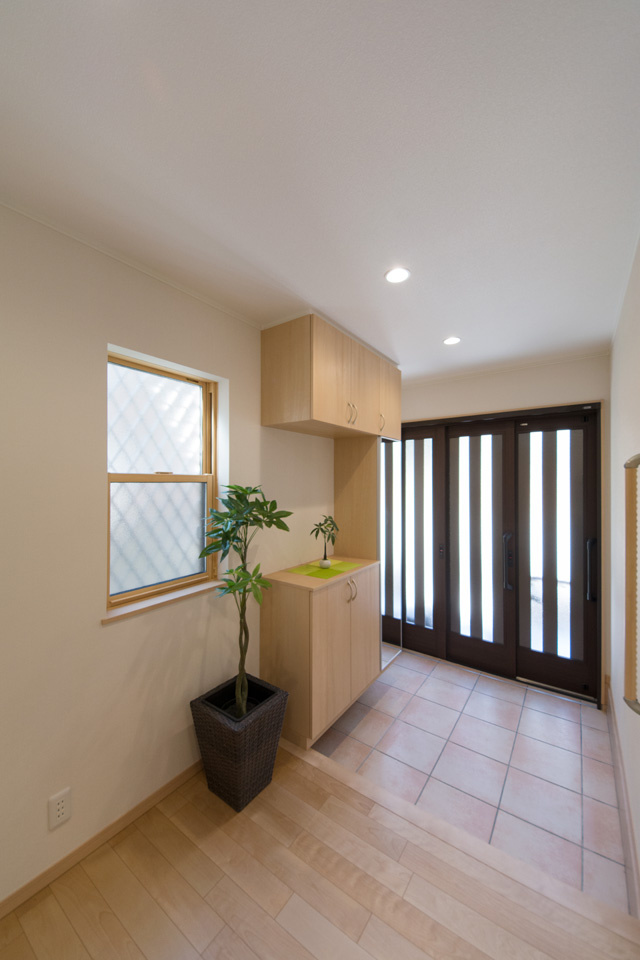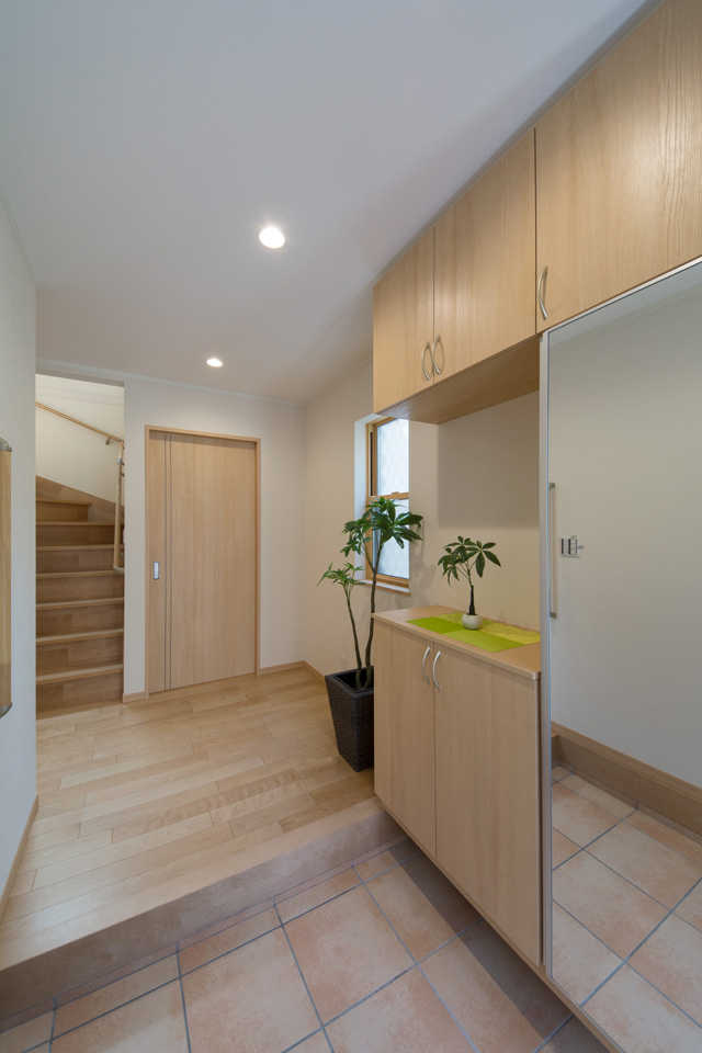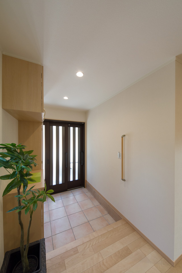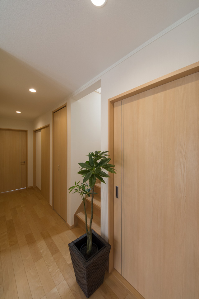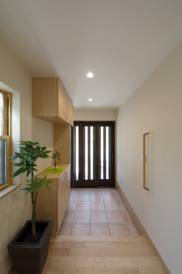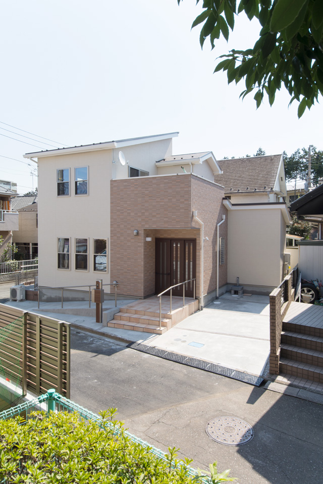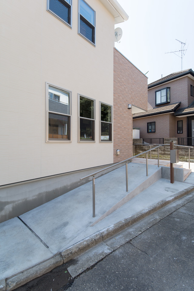 車いすやベビーカー、足腰の弱い方がスムーズに安心して通れる様、スロープと手摺を設置したエントランス。室内は玄関を始め、全てのお部屋に開け閉め簡単な引戸を設置しました。安全で快適な空間への配慮を随所に取り入れ、一階を中心とした生活同線を心がけました。