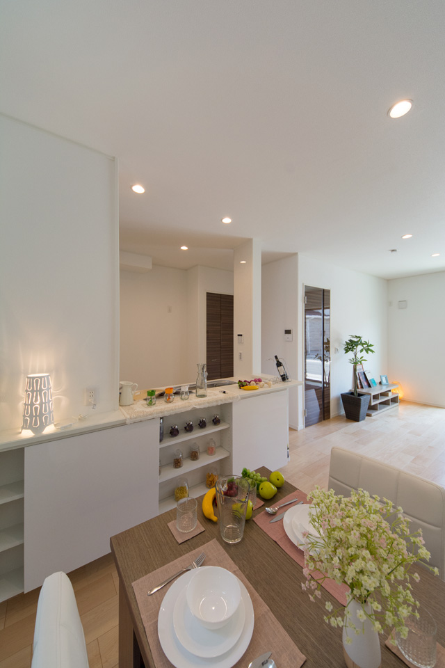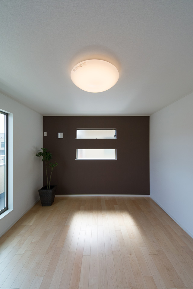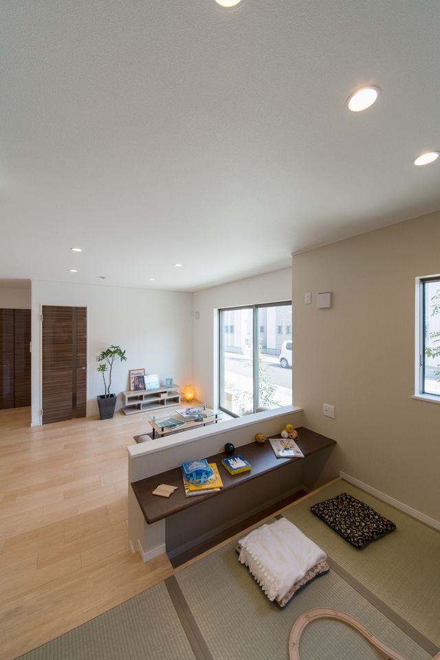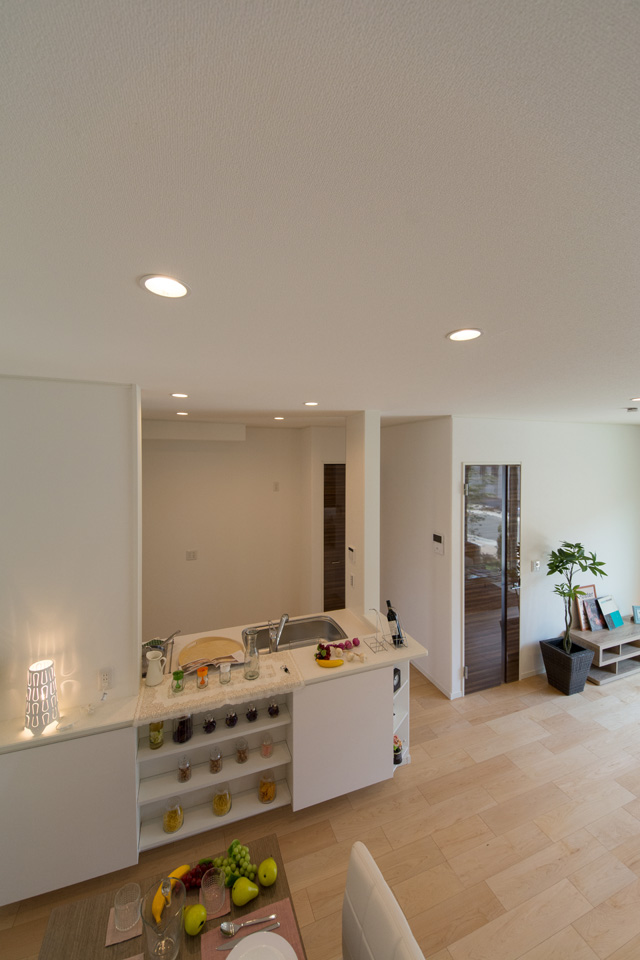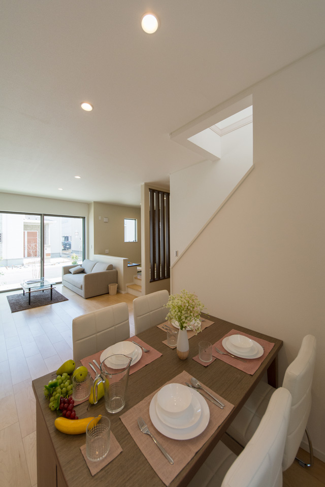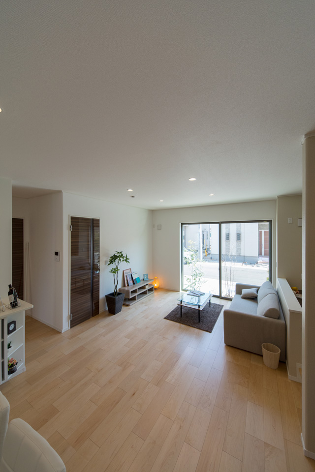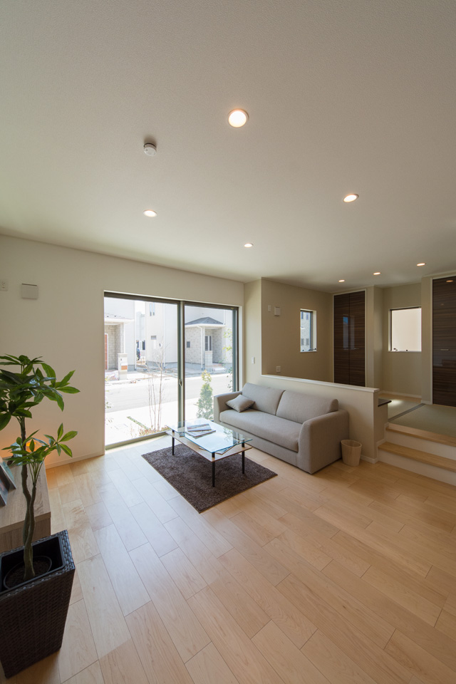 アイボリーを基調に、スティック状にしたオレンジ系色を交互に積み重ねたデザインの外壁は、温かみのある色彩で街並みに溶け込むナチュラルな外観。室内は風と光の心地よい開放的な空間で全体的にナチュラルテイストに仕上がりました。