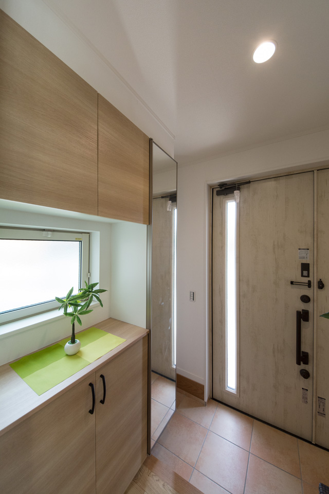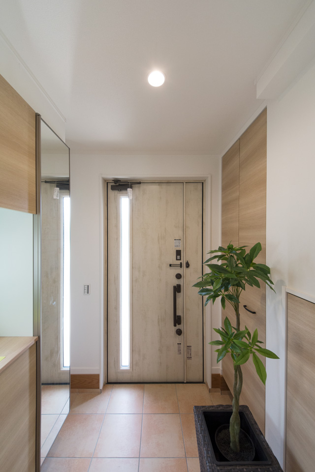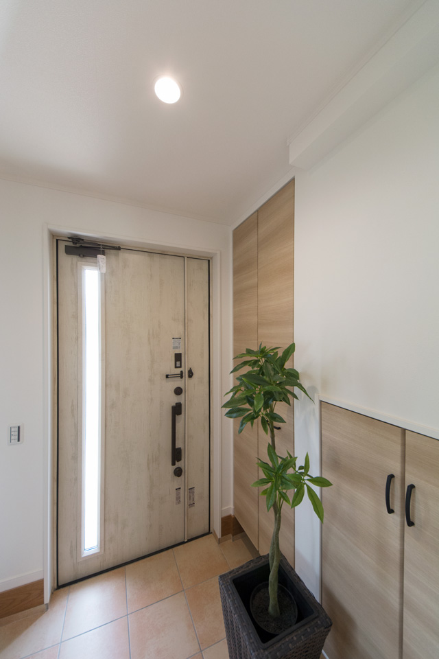 アイボリーの玄関扉とベージュのテラコッタ調タイルがナチュラルな雰囲気を演出。