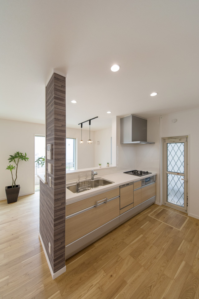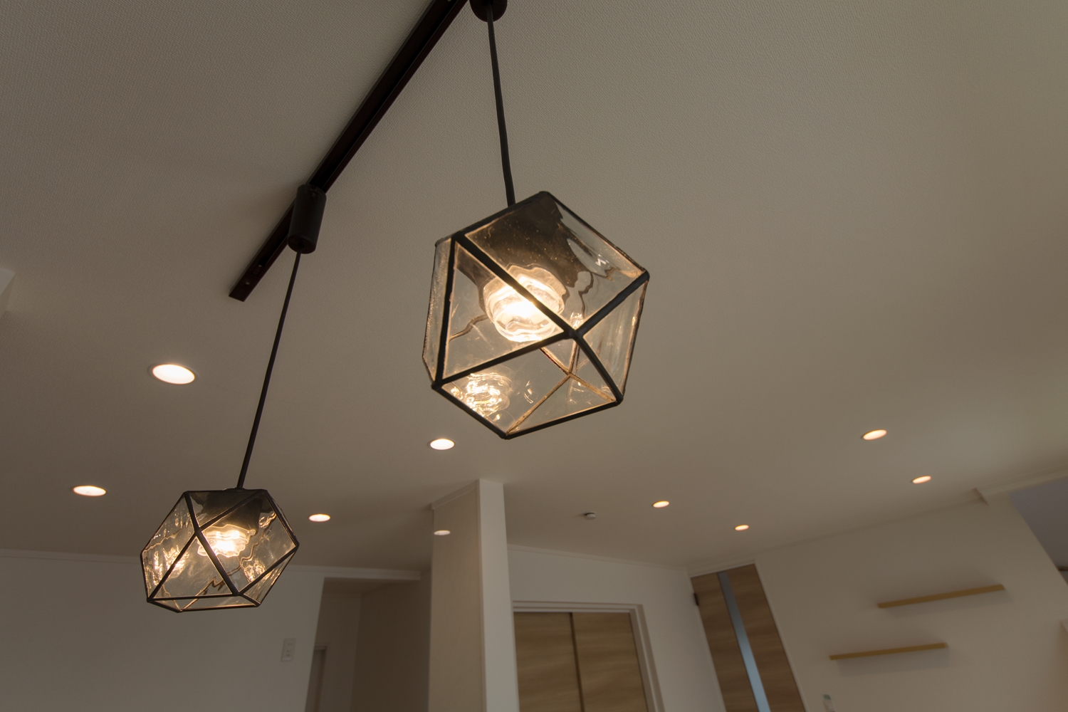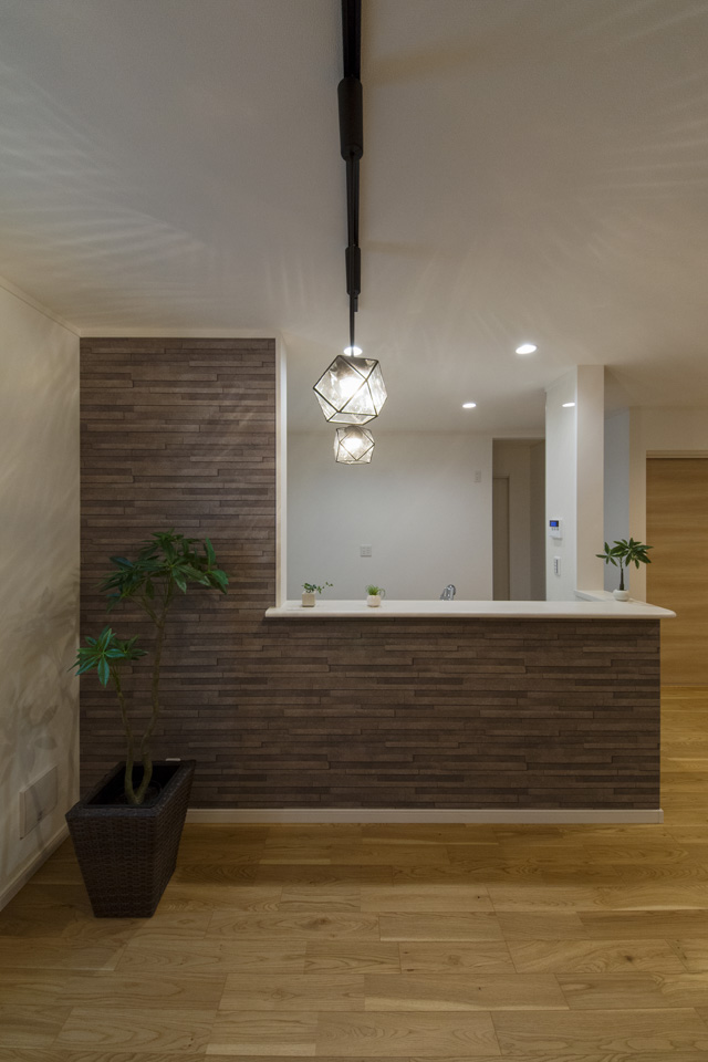 キッチン前のスタイリッシュなアクセントクロスに、ペンダントライトの陰影が雰囲気のあるダイニング空間を演出。