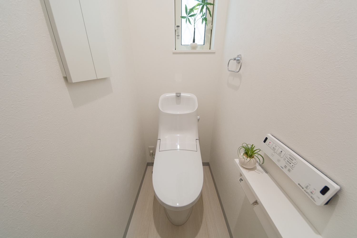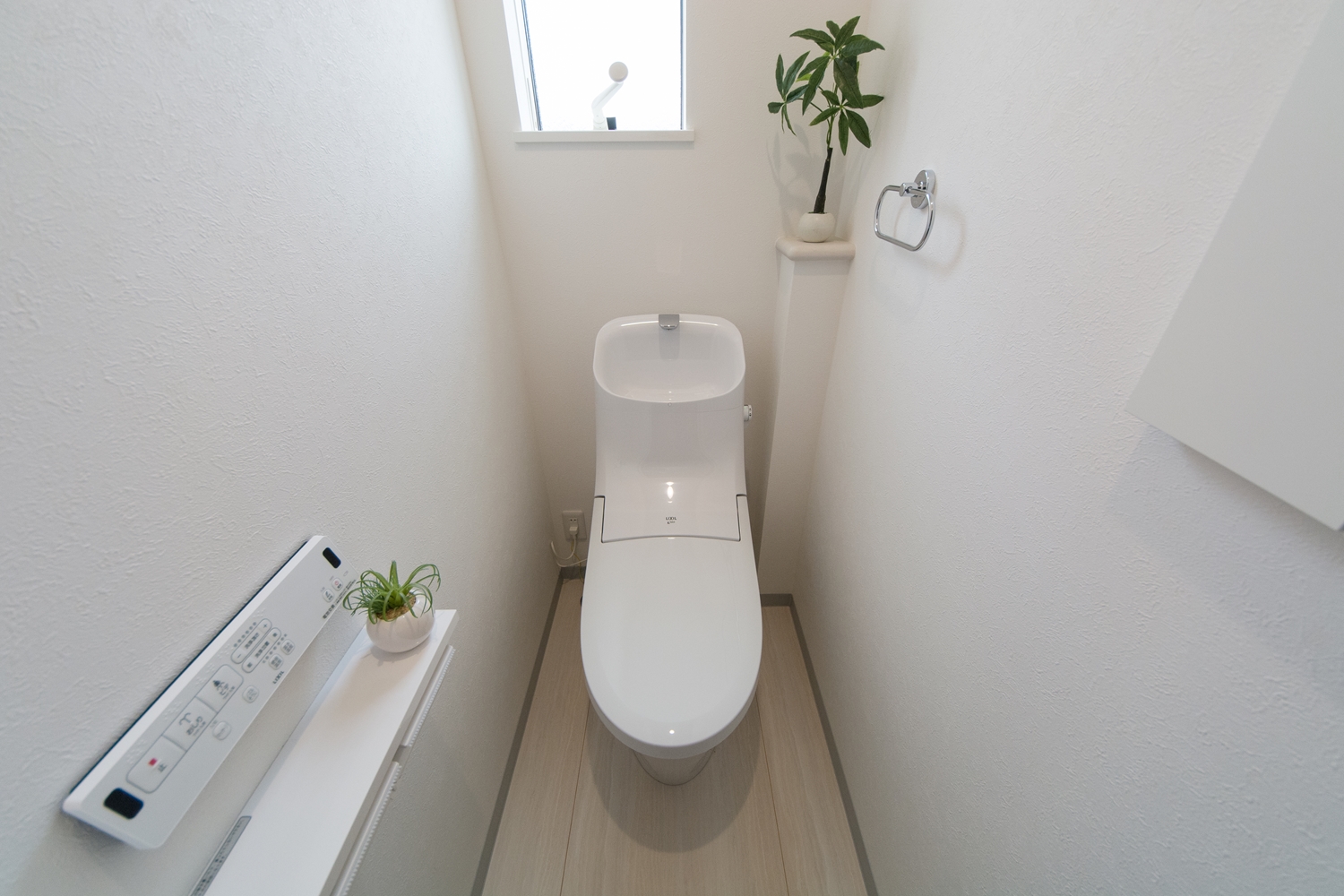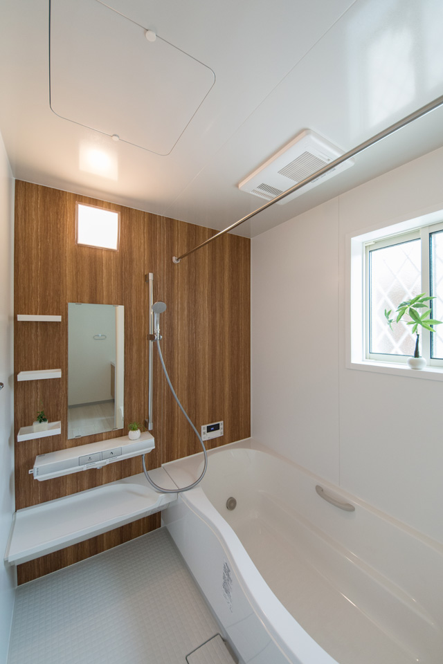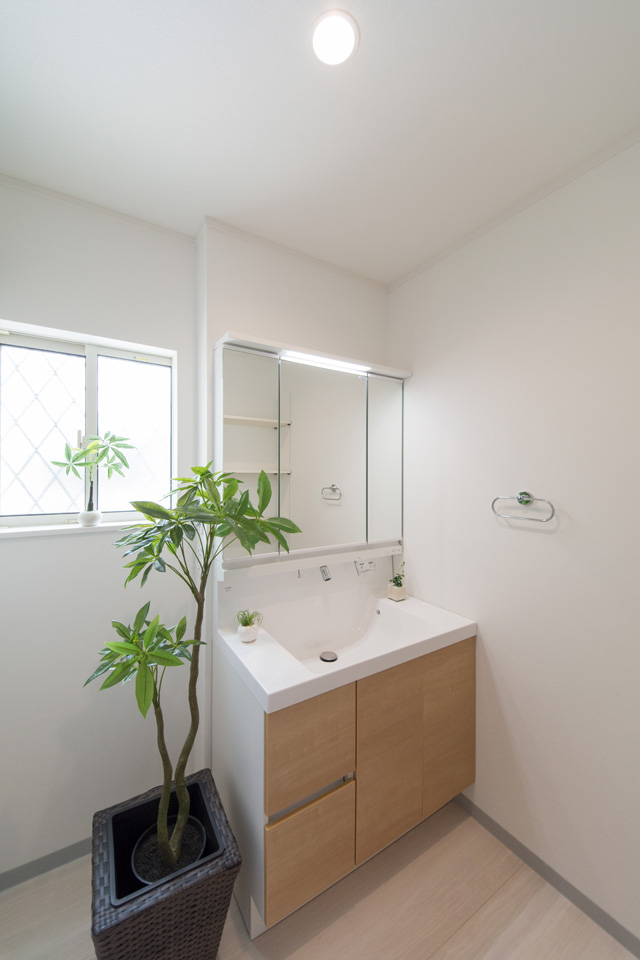 白を基調とした清潔感のあるサニタリールーム。木目調の洗面化粧台がナチュラルな空間を演出。