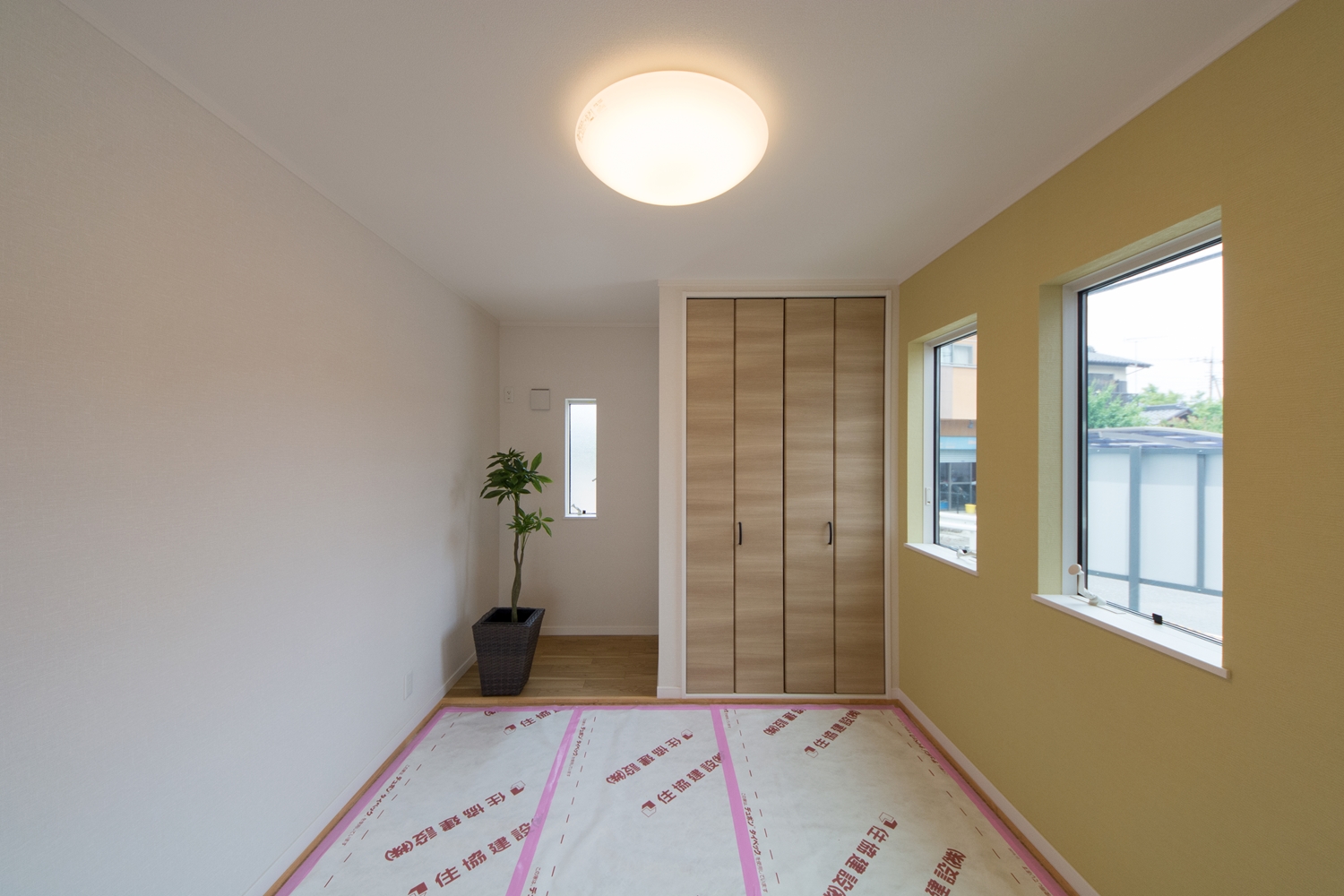 イエローのアクセントクロスが空間を彩る畳敷き洋室(写真は畳設置前)