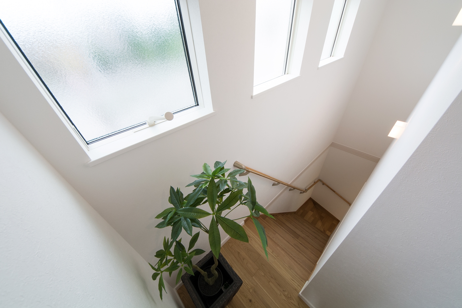 窓からの穏やかな光が降り注ぐ開放感のある階段。