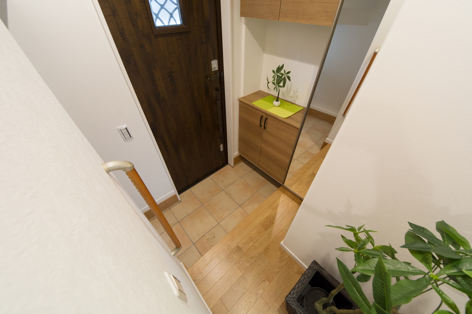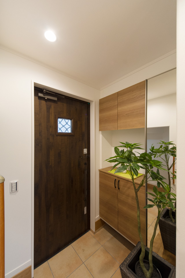 ココナッツブラウンの玄関扉とベージュのテラコッタ調タイルがナチュラルな雰囲気を演出。