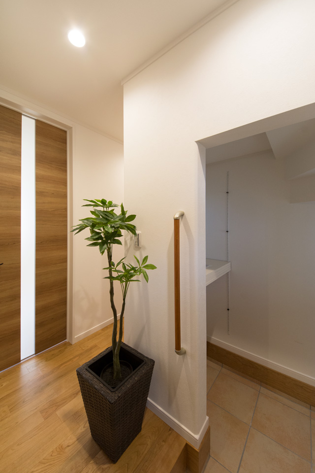 室内に持ち込めない、ベビーカーやスポーツ用品、アウトドアグッズなどの収納に便利なシューズクロークを備えた玄関