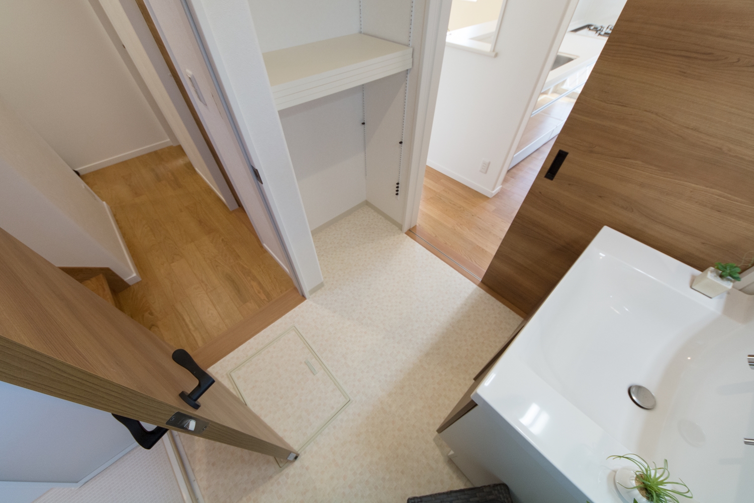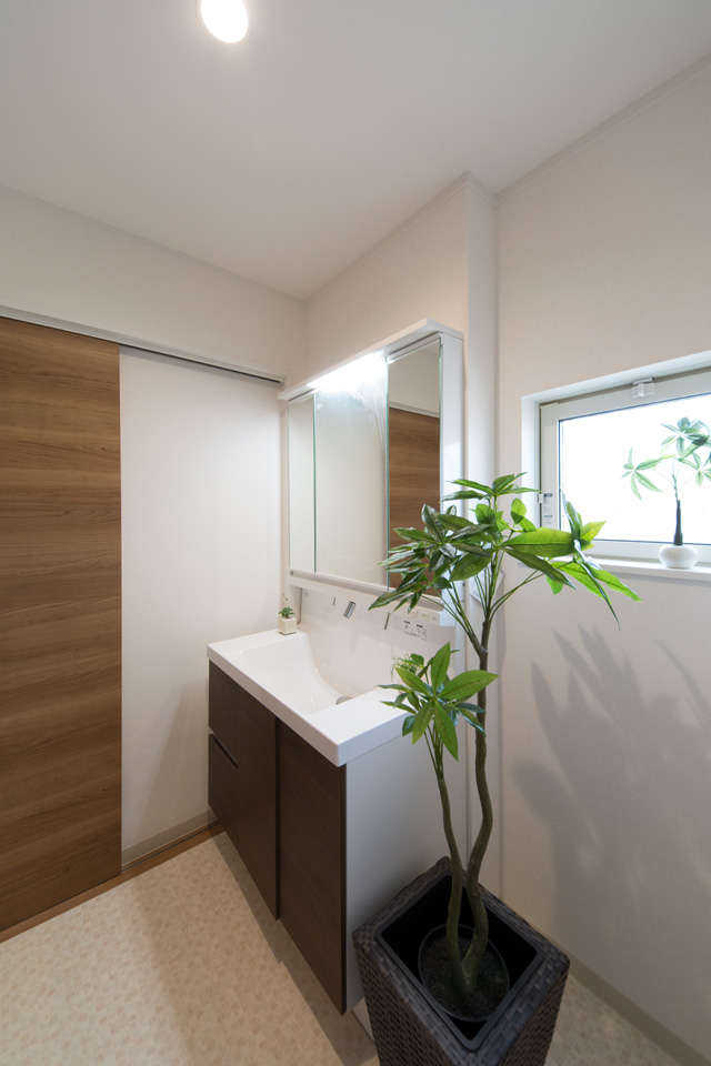 洗面化粧台扉をモカ色でアクセント、ナチュラルな空間のサニタリールーム。