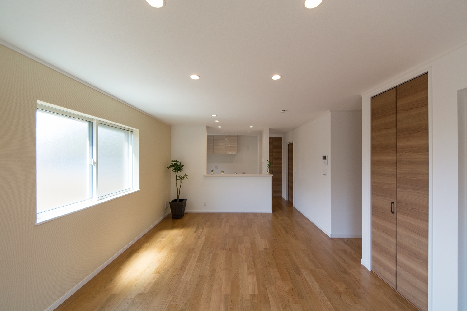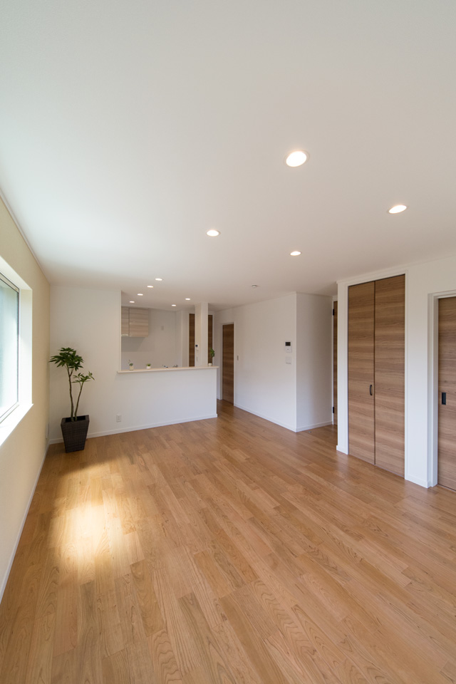 扉を開けてひとつなぎになった畳式洋室(写真は畳設置前)はリビングに開放感をプラスしてくれます。