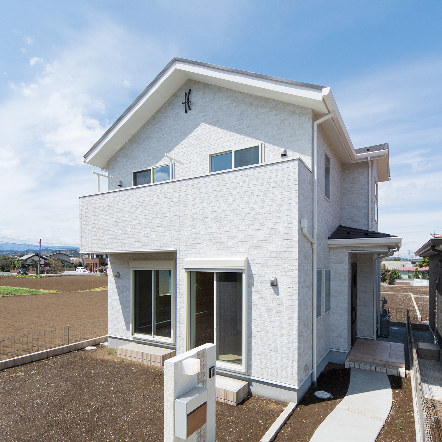 石積み柄ホワイトの外壁にオーナメントをあしらった外壁。青空に映える、清潔感のあるシンプル&ナチュラルな洋風デザインに仕上がりました。