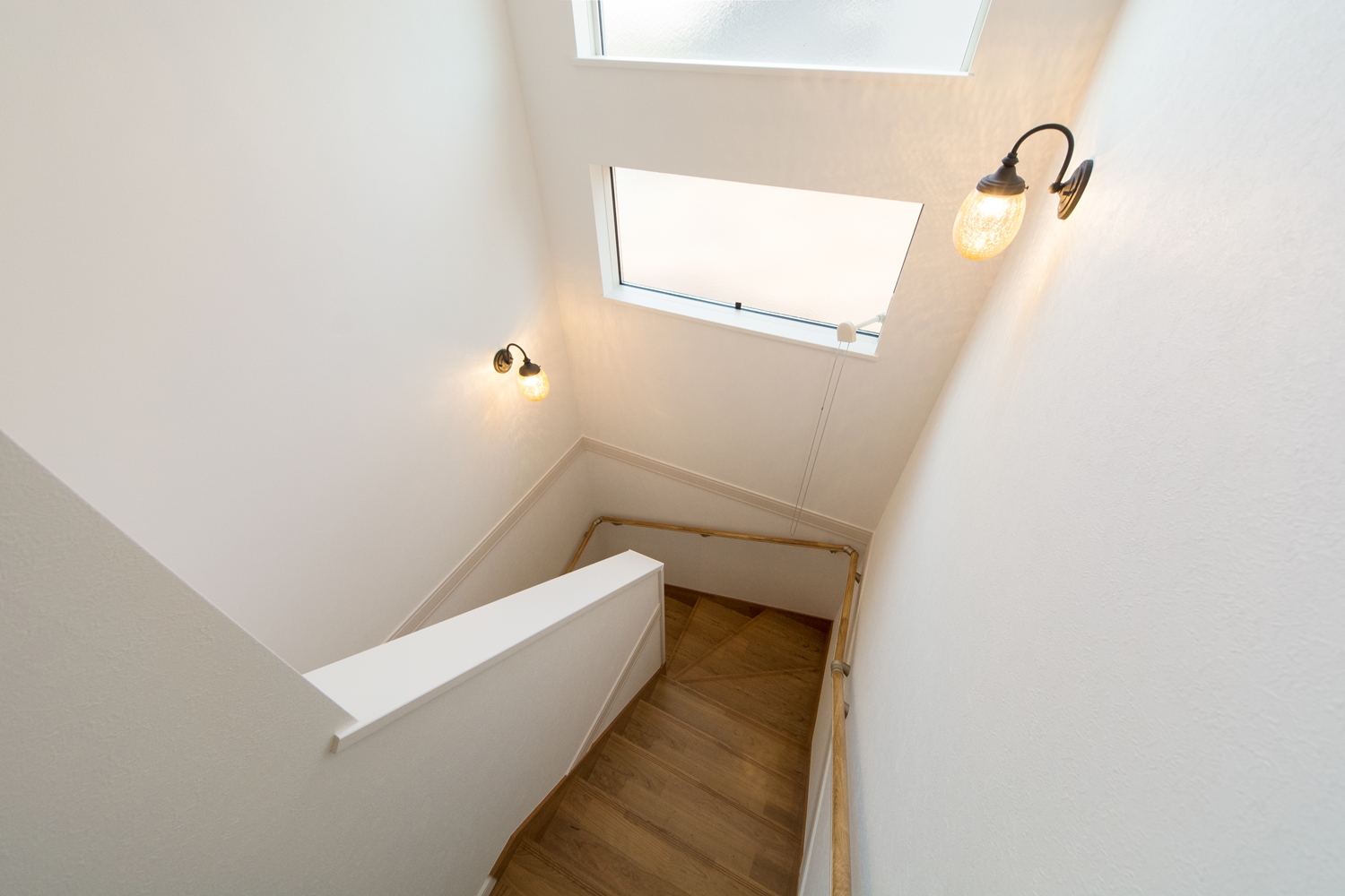 窓からの穏やかな光が降り注ぐ開放感のある階段。