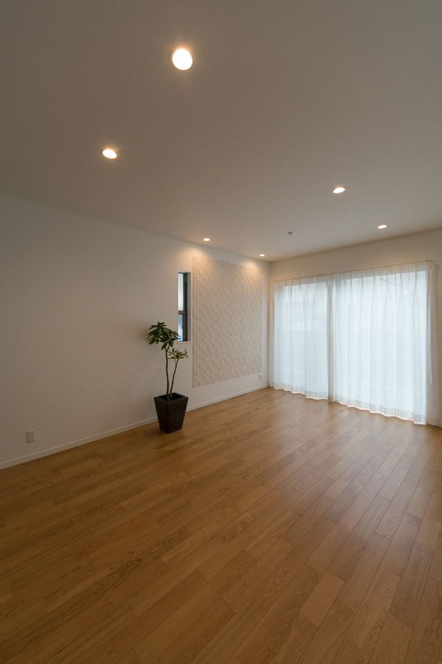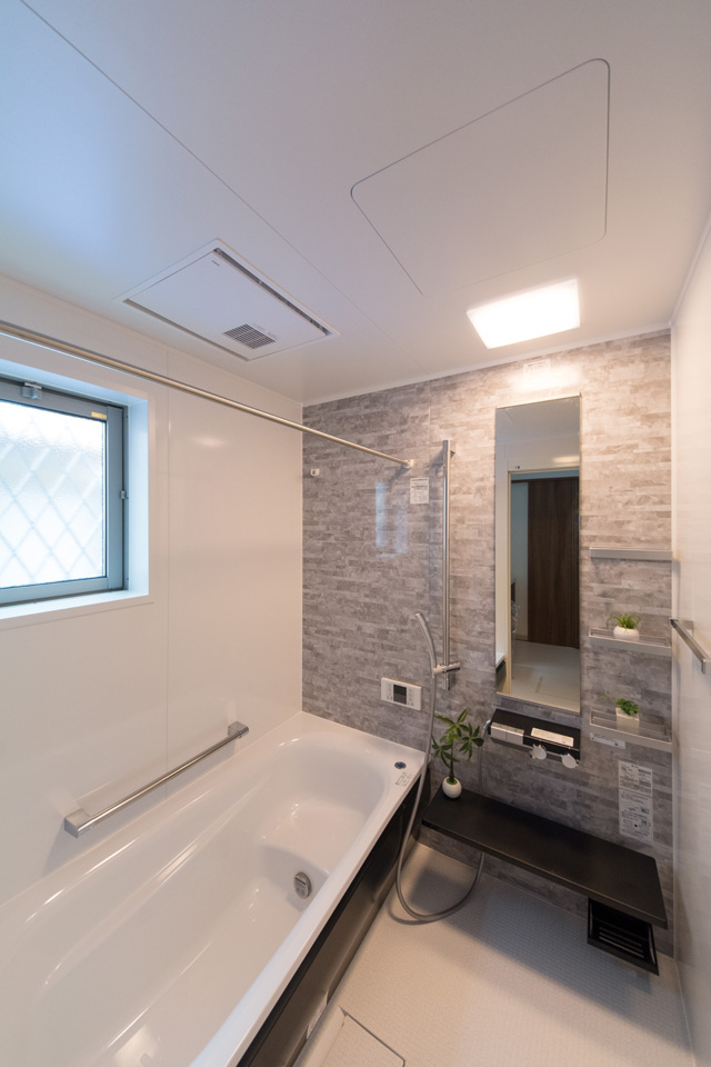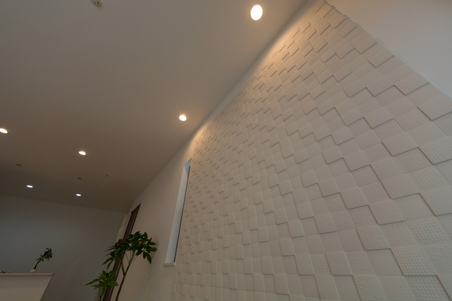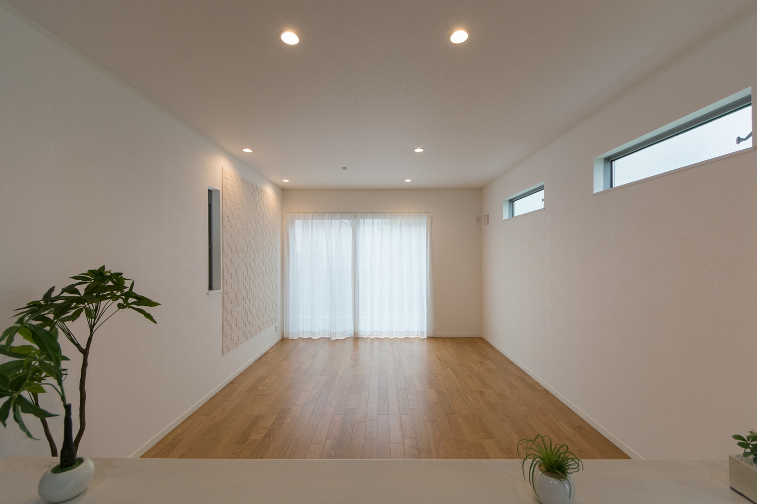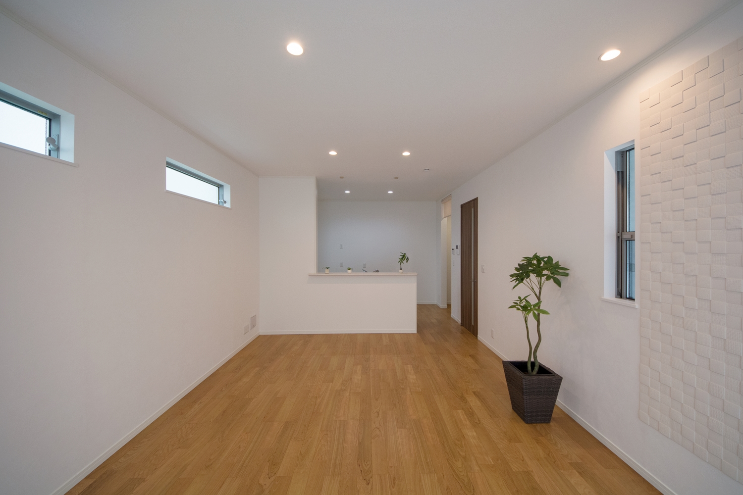 グレー×ブラックのモノトーンカラー、飽きのこないスタイリッシュモダンな外観に仕上がりました。内装は、今人気のインテリア壁材「エコカラット」をあしらったリビングに、ハイスタッド天井で高く広々とした空間のLDKとなっています。
