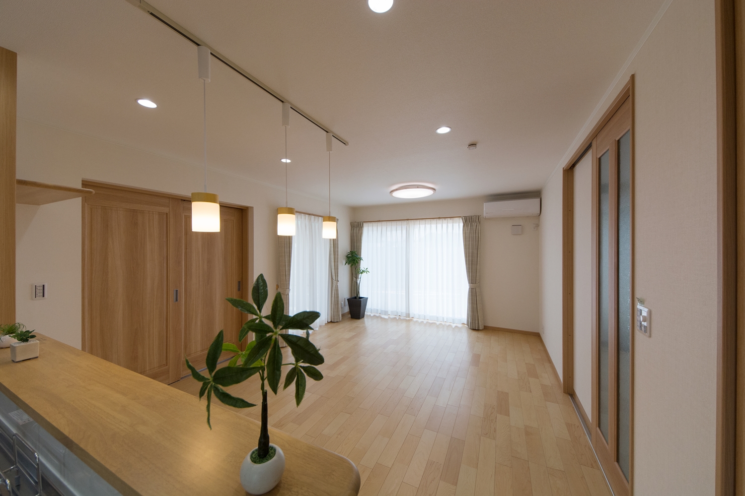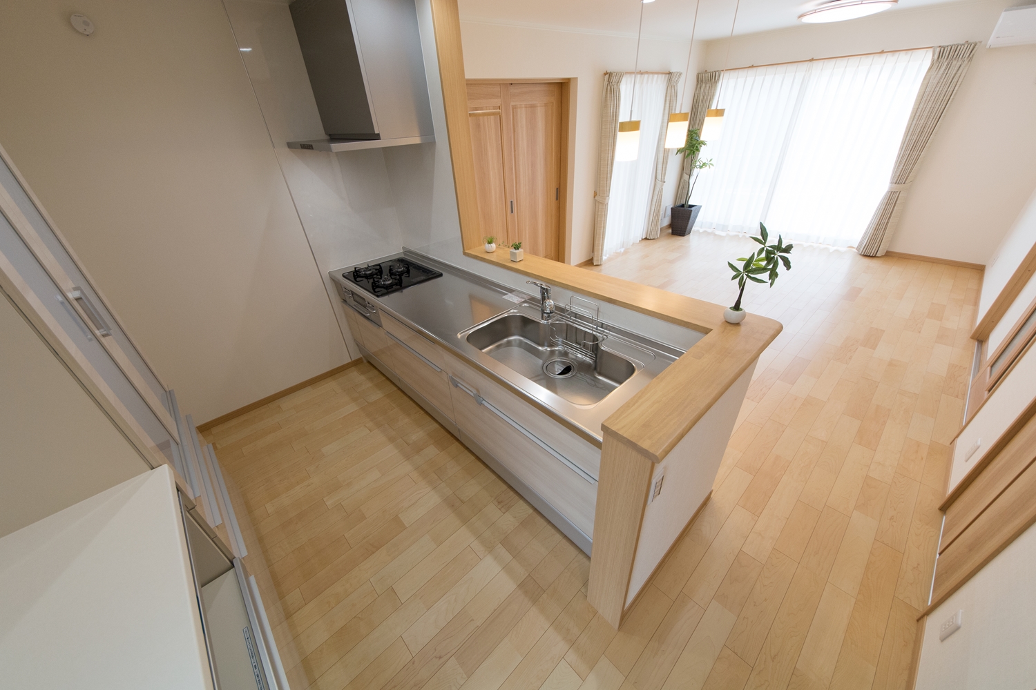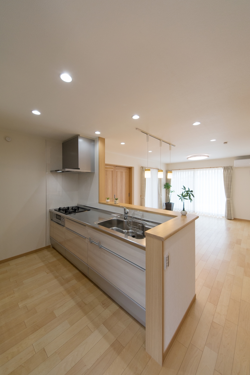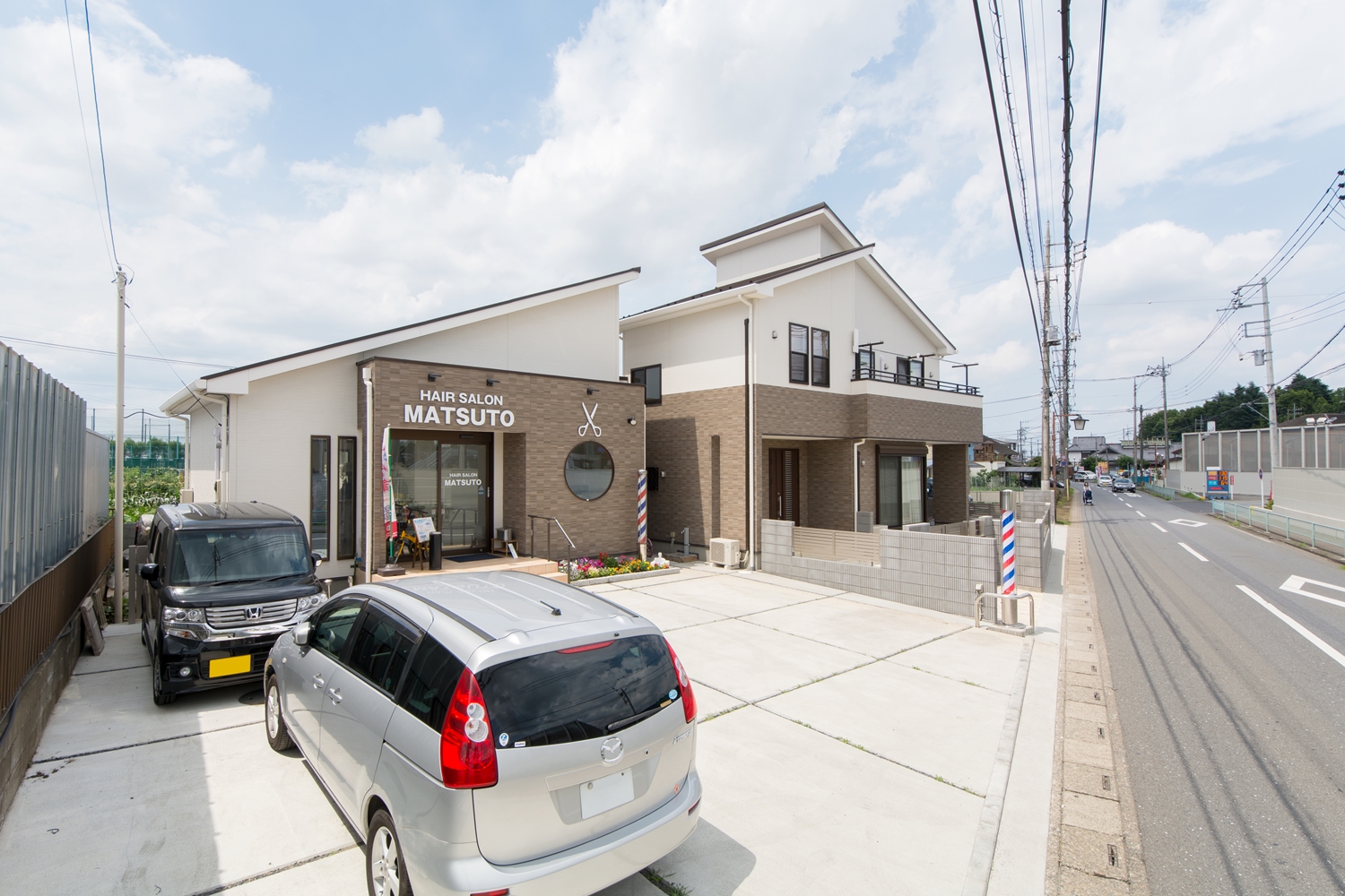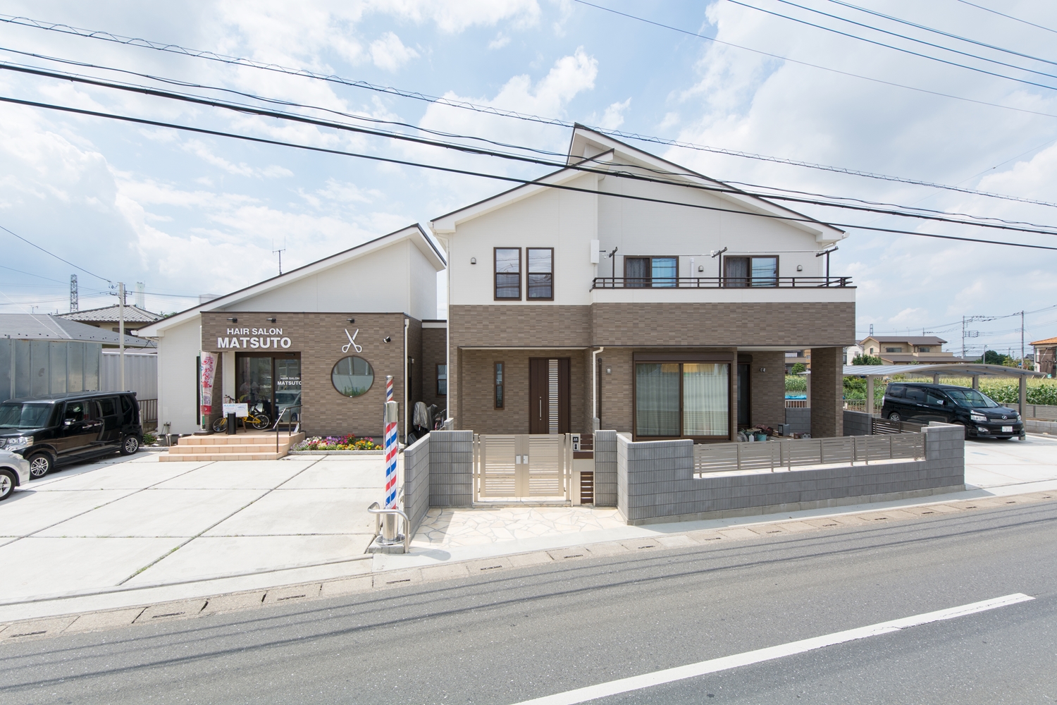美しい屋根の傾斜が印象的な一体感のあるデザイン。理容室と住居を左右に分けた、見た目も機能性も融合した、店舗併用住宅が完成しました。内装は木のやさしい風合いを感じる、穏やかで心地のよい空間。理容室と住居の間は、廊下で繋がっていて行き来する事が可能です。