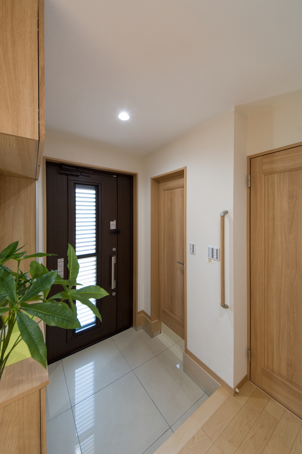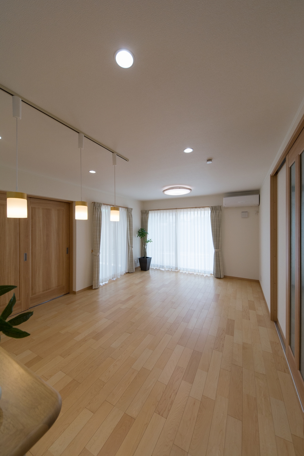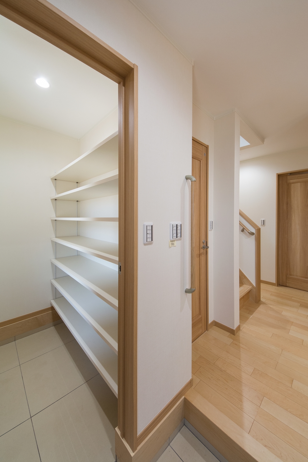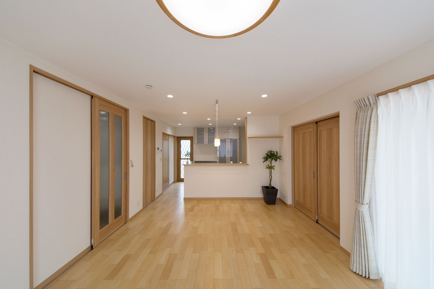 美しい屋根の傾斜が印象的な一体感のあるデザイン。理容室と住居を左右に分けた、見た目も機能性も融合した、店舗併用住宅が完成しました。内装は木のやさしい風合いを感じる、穏やかで心地のよい空間。理容室と住居の間は、廊下で繋がっていて行き来する事が可能です。