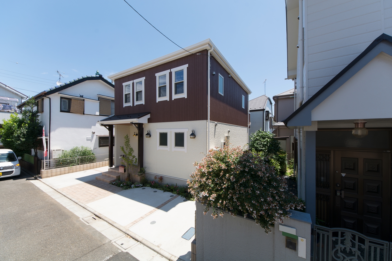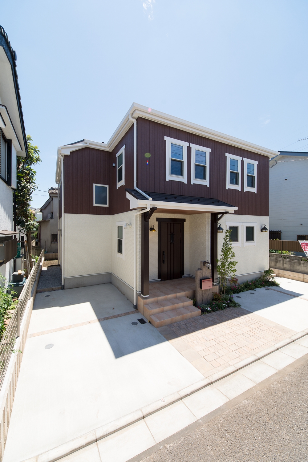 白い窓モールがアクセント。赤み掛かった木目調サイディングに白の石目調サイディングを張り分けた北欧デザイン。