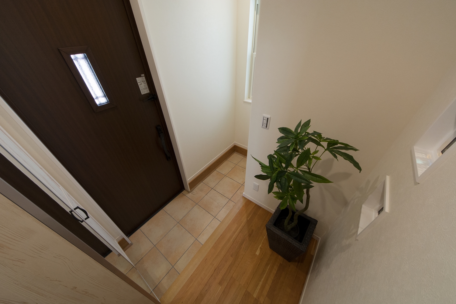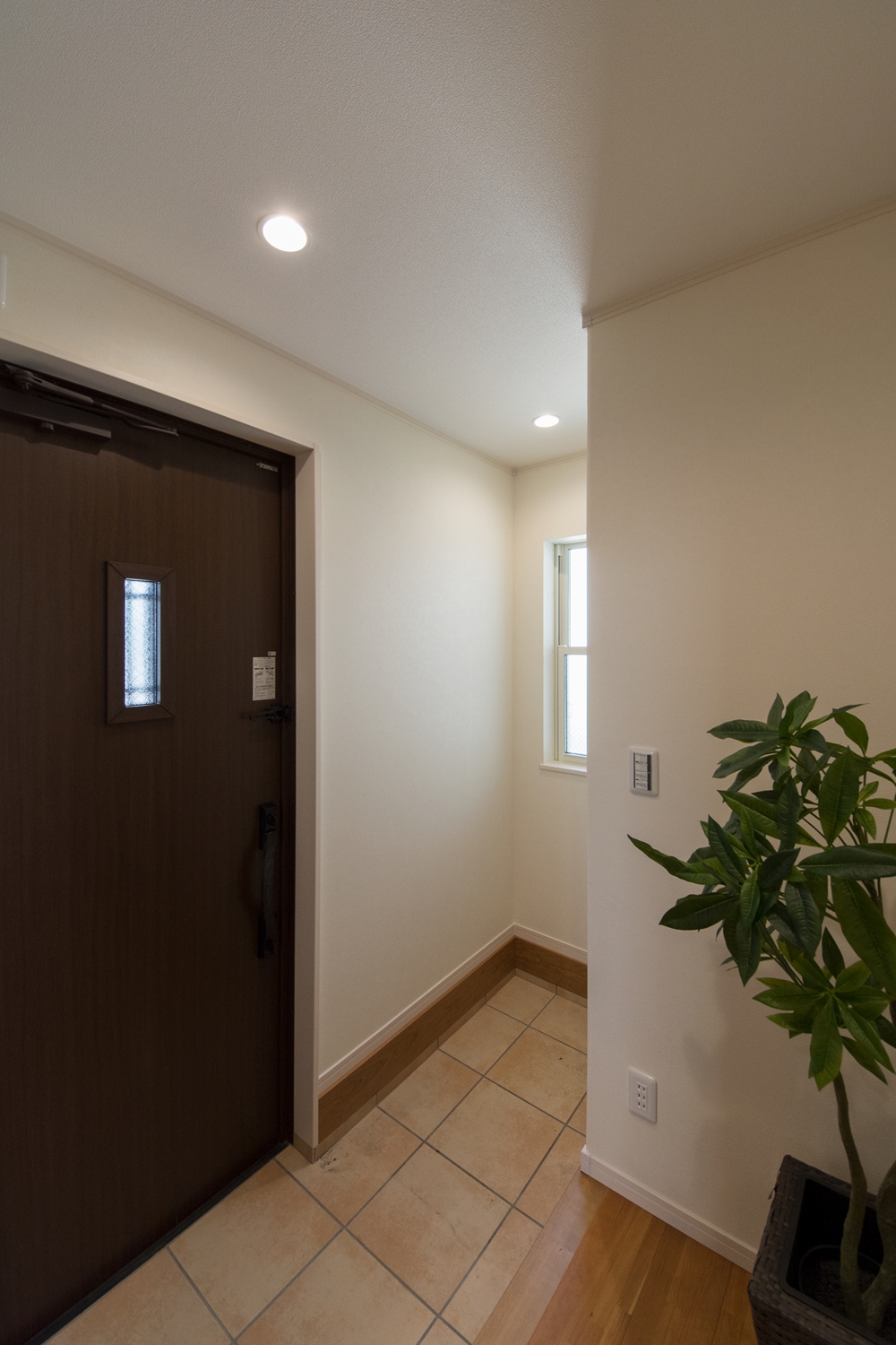 ショコラ色の玄関扉とベージュのテラコッタ調タイルがナチュラルな雰囲気を演出。
