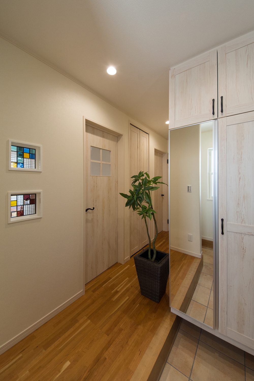 目を惹く色鮮やかなステンドグラス。玄関収納扉も室内のドアとお揃いのデザインに。