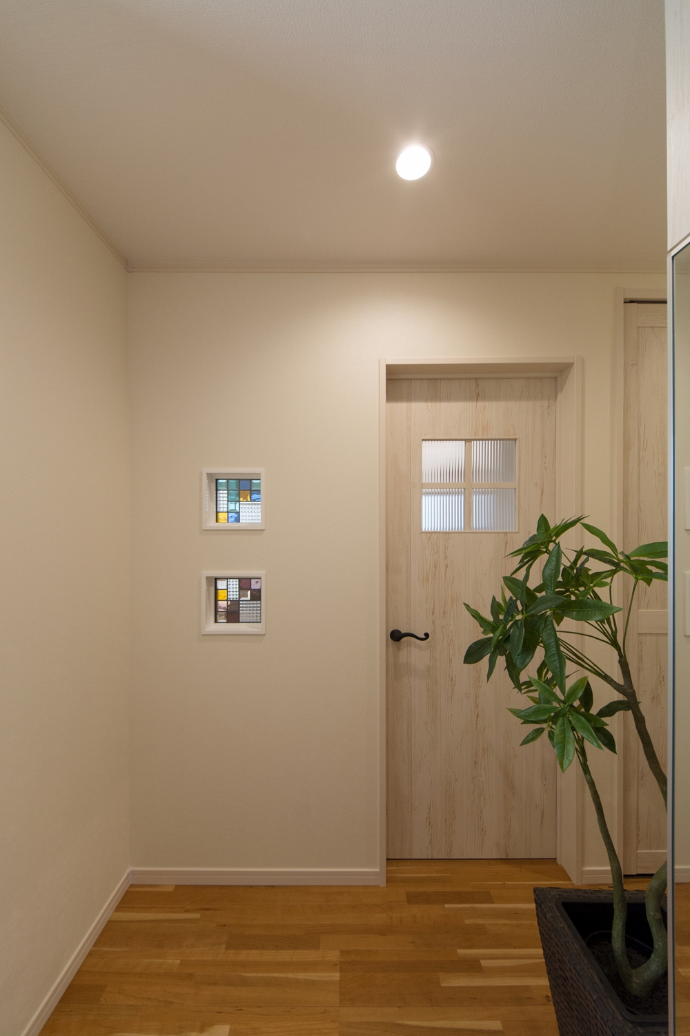 玄関ホールとリビングの間に設えたステンドグラスが空間を彩ります。