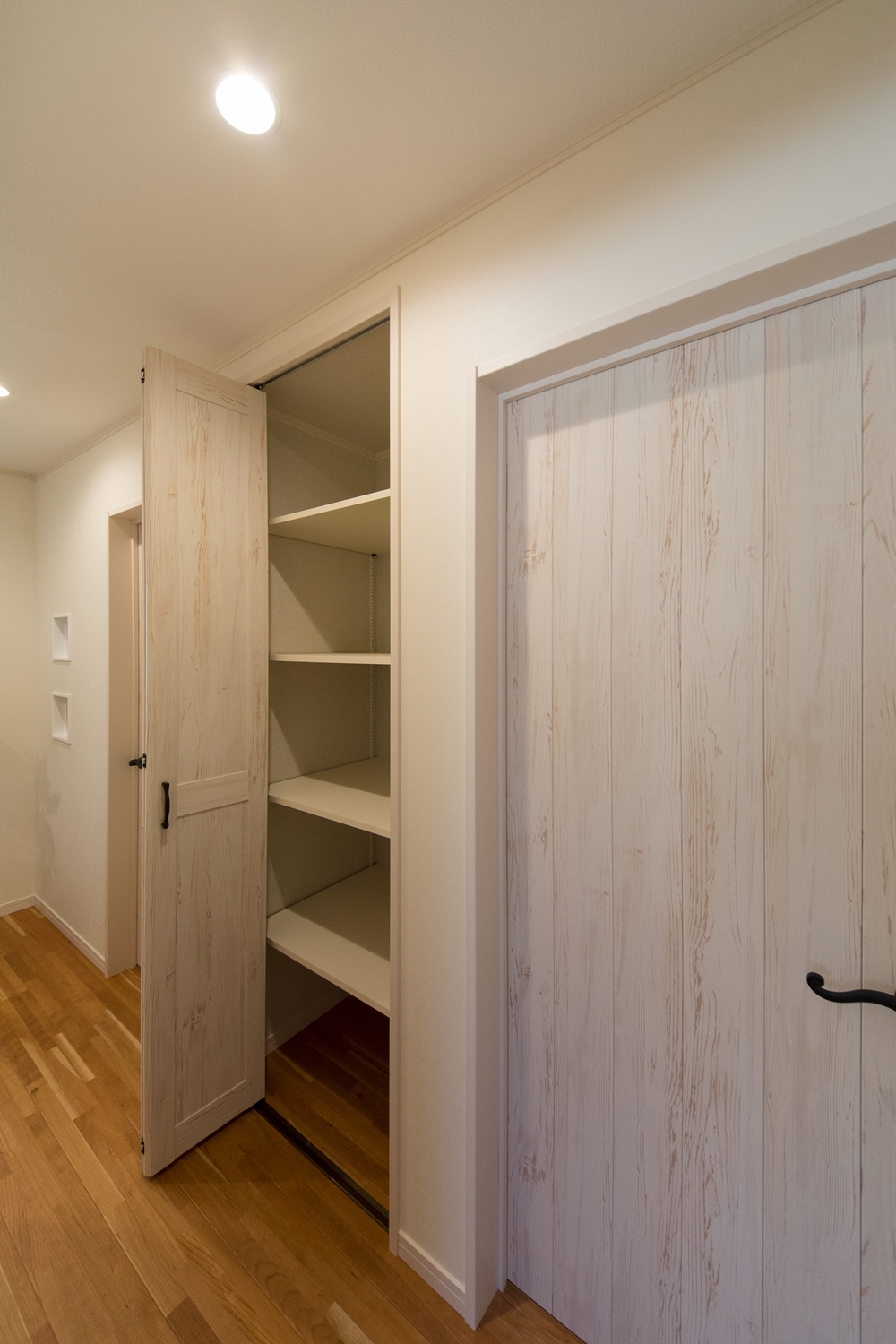 廊下の収納スペース。入れたい物の高さに合わせられる可動タイプの棚。