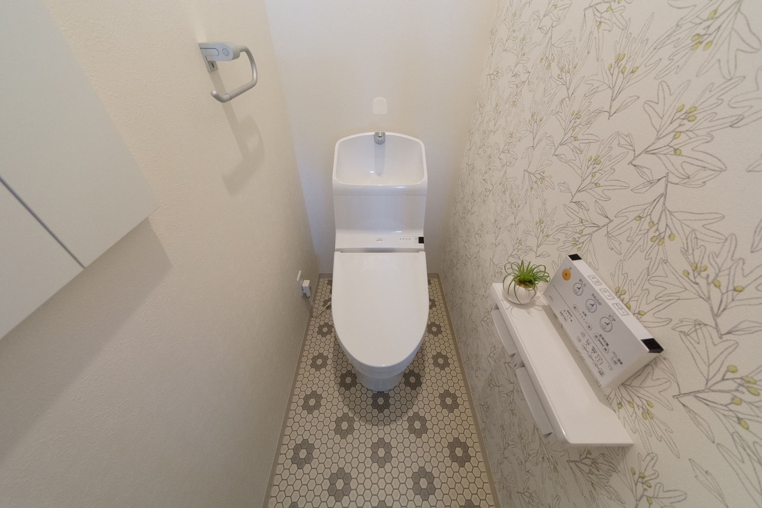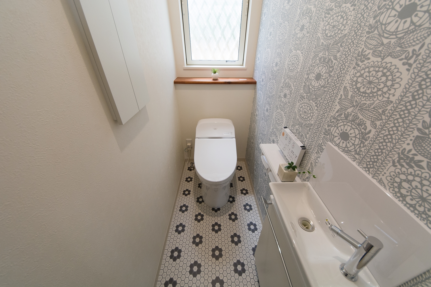 1Fトイレ/植物柄アクセントクロスと花柄フロアの「柄」×「柄」の組合せがオシャレ。