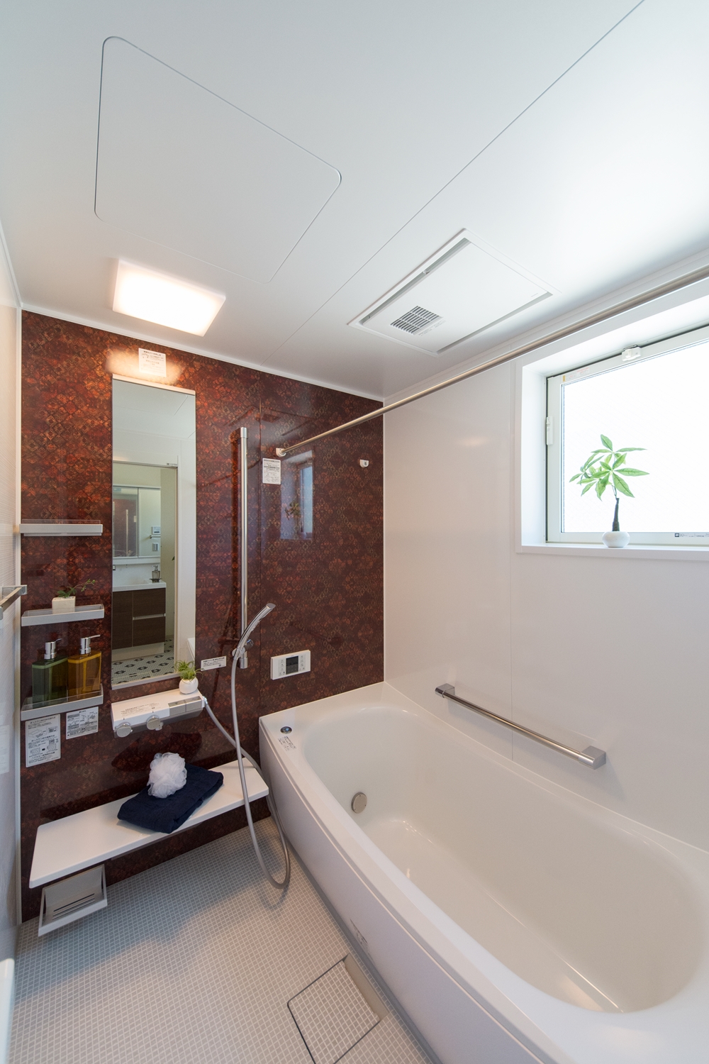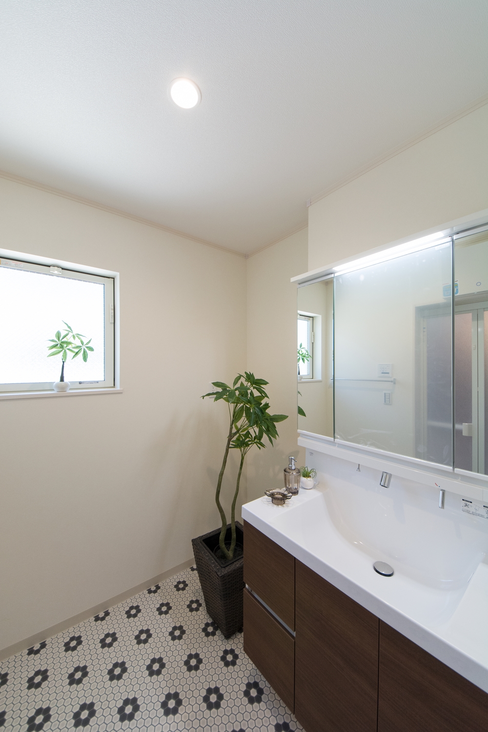 愛らしい花柄のフロアが印象的なサニタリールーム。洗面台はワイドなタイプで広々とお使いいただけます。