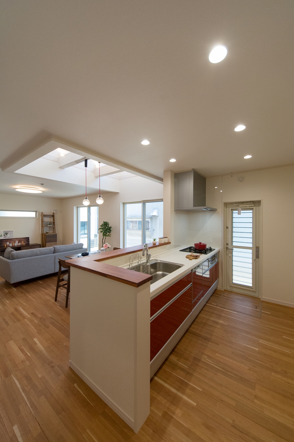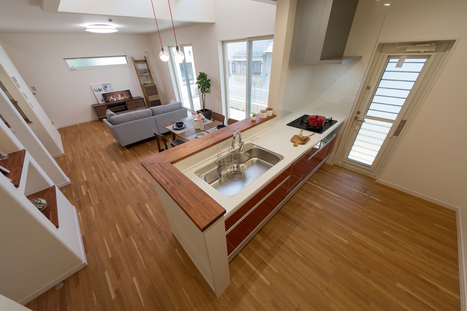リビングを見渡せる対面式キッチン。家事をしながらご家族との会話も弾みます。