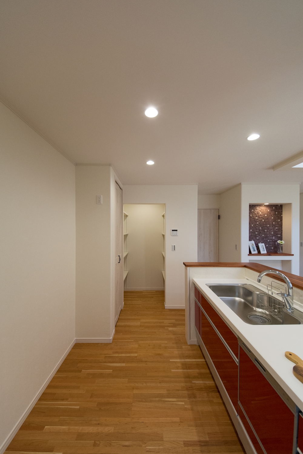 キッチン廻りをいつもスッキリ使えるパントリーを配したミセスに嬉しい設計に。