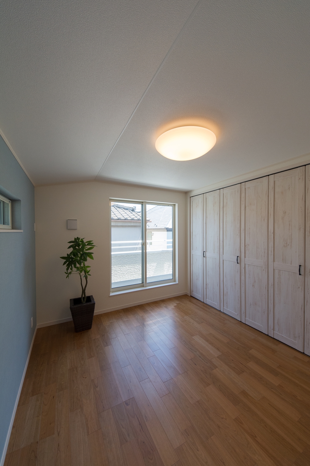 2F洋室/北欧スタイルの家具が良く似合うシャビーシックなホワイトの建具に淡いブルーグリーンのアクセントクロス。